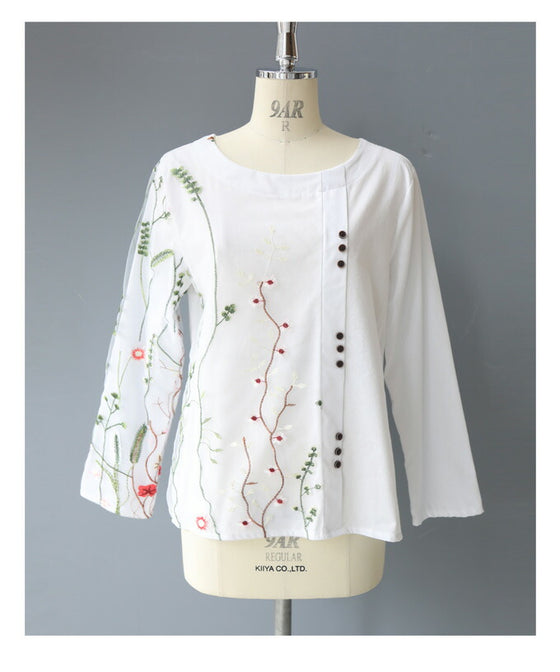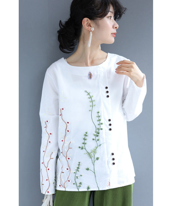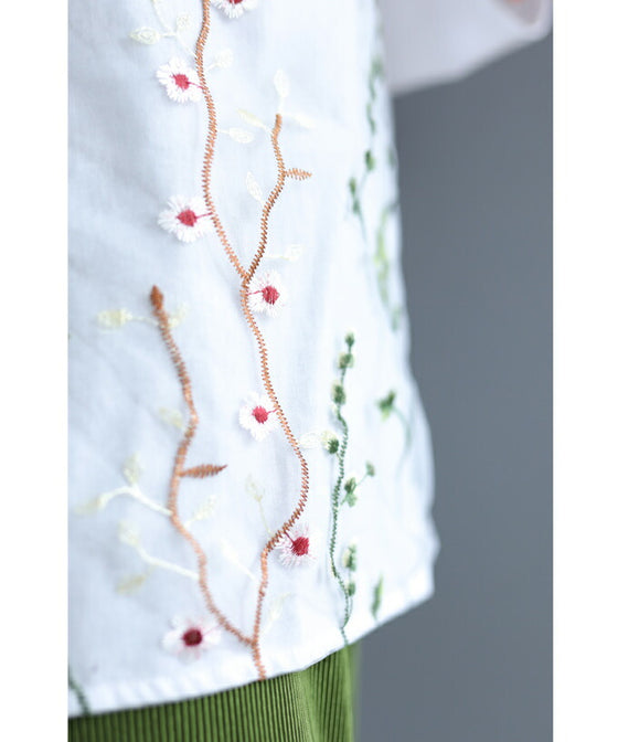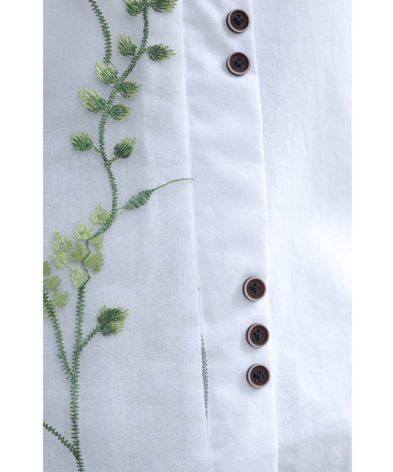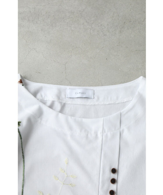 This top features a cute, spring-like vibrant embroidery. The three lined up buttons add an accent and a casual feel.