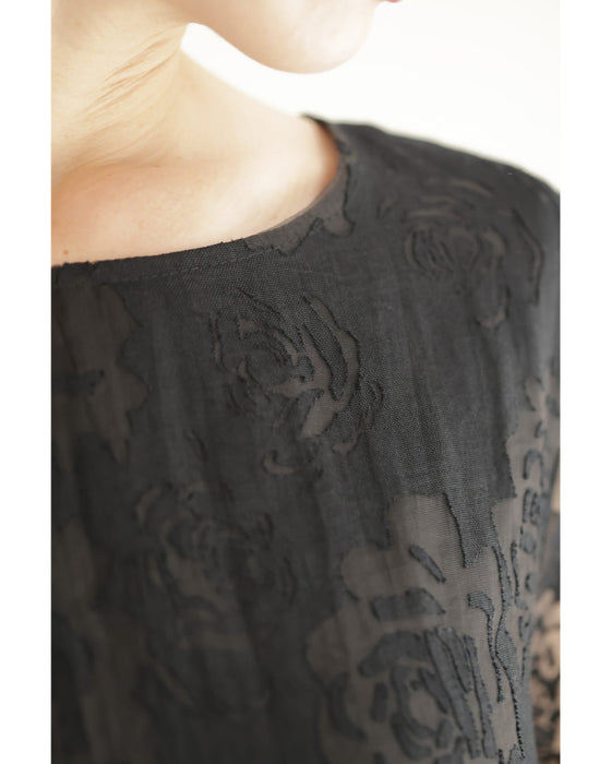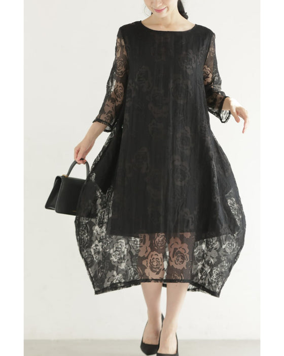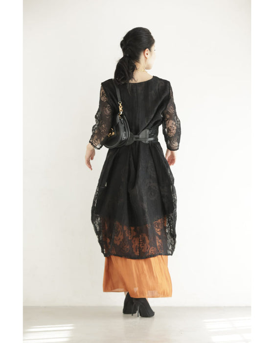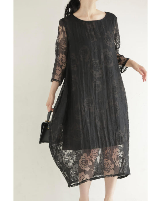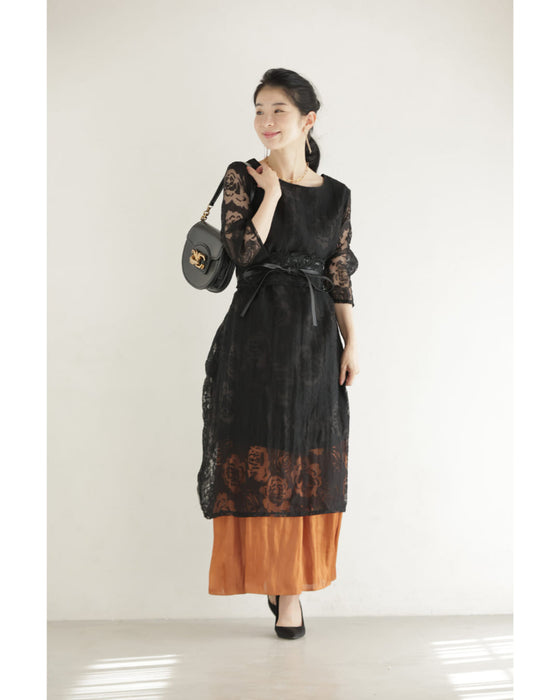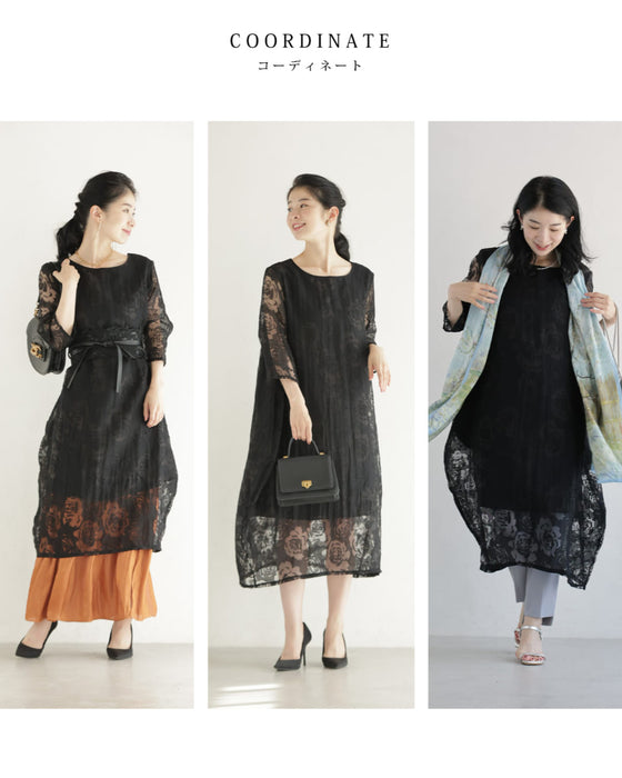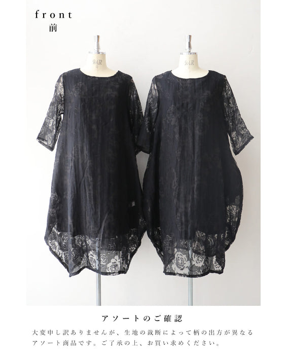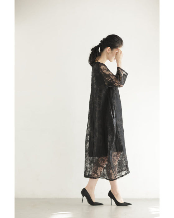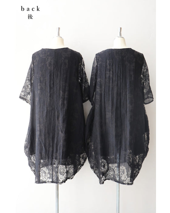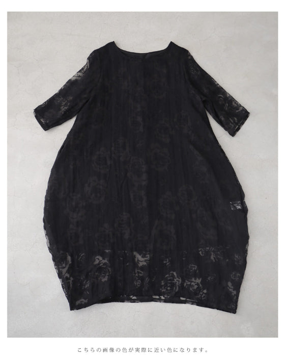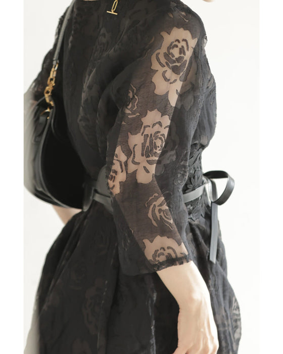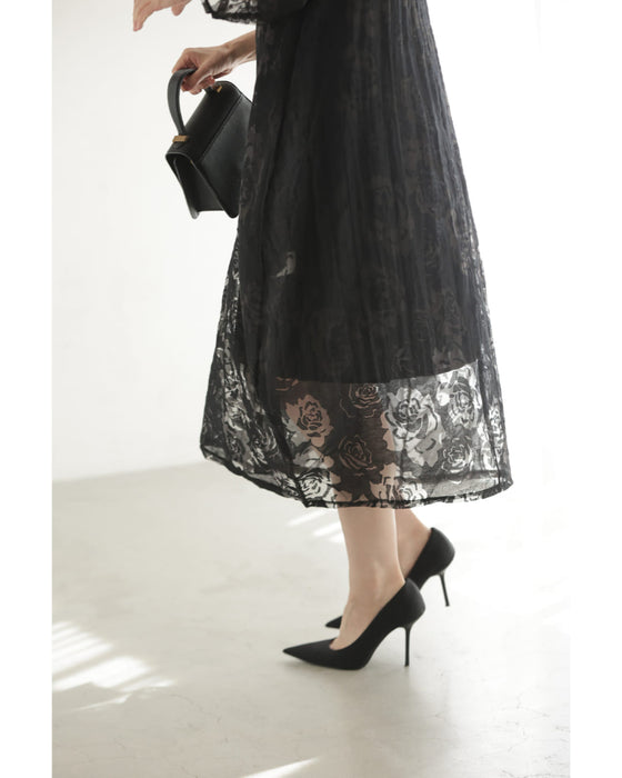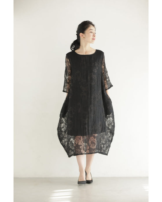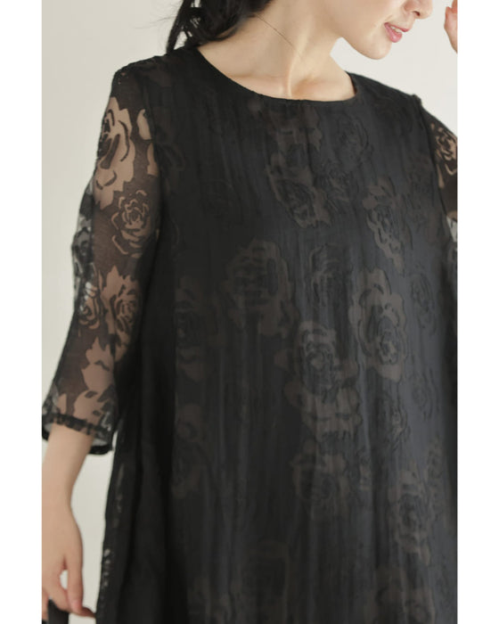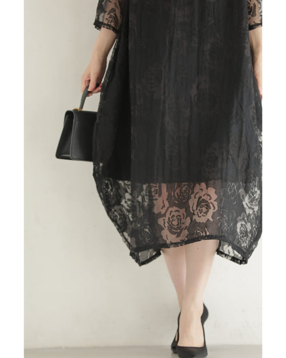 バラの透かし絵浮かぶふんわりシルエットミディアムワンピース