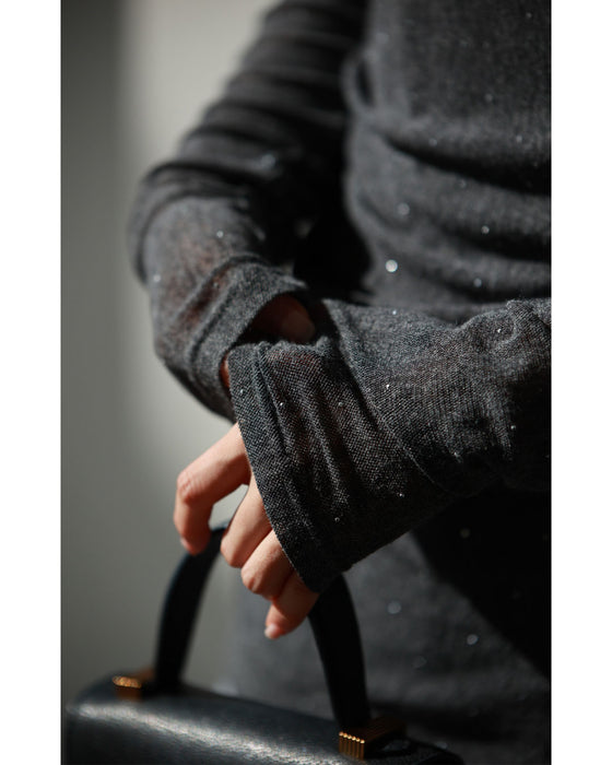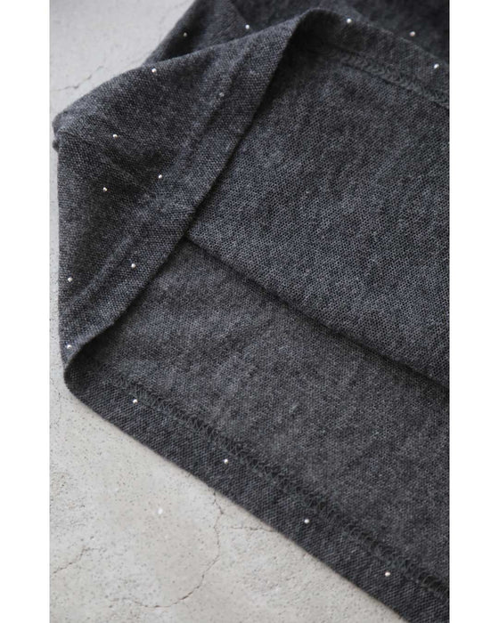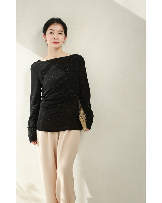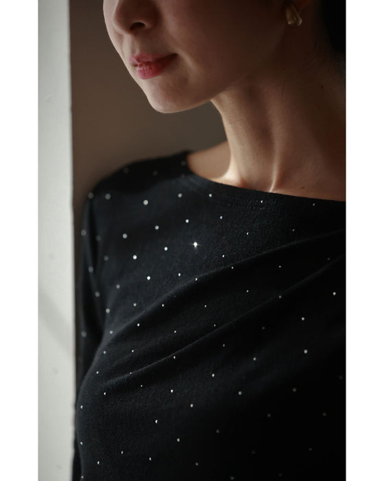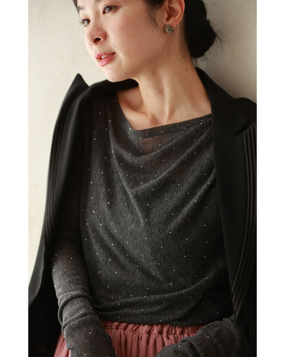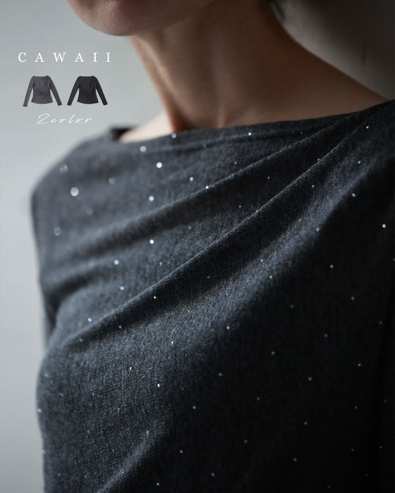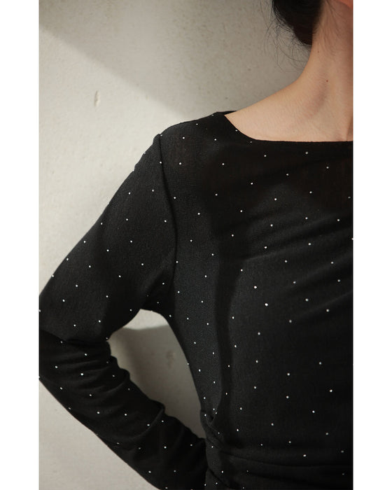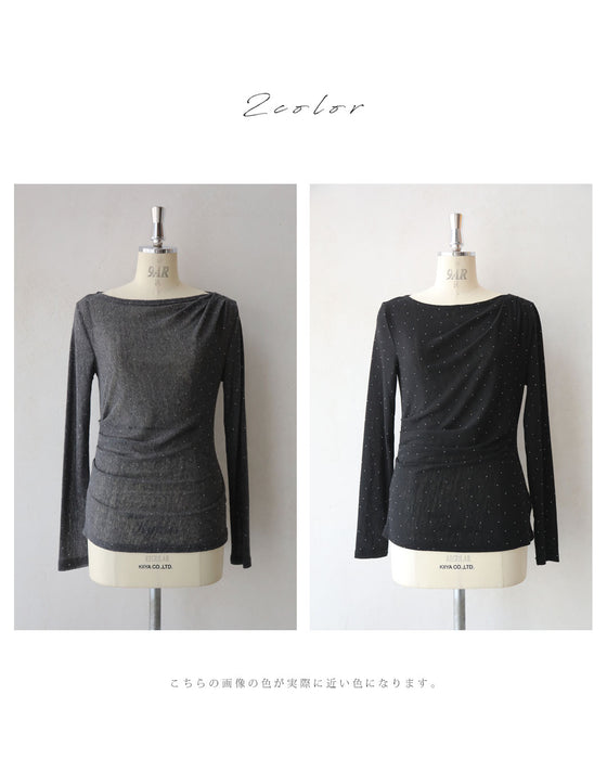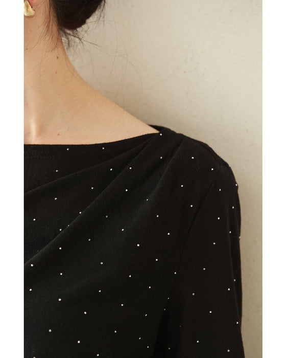 A thin cut-and-sew top with draping and sparkling rhinestones