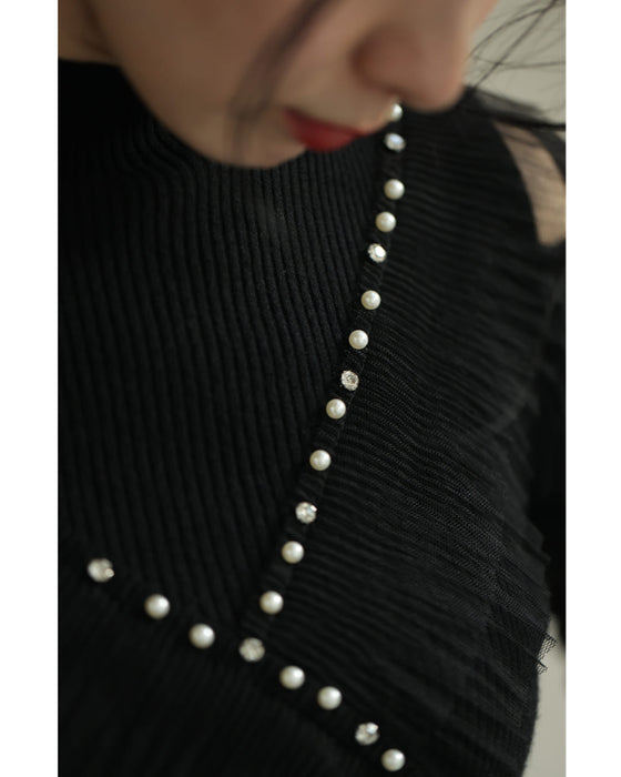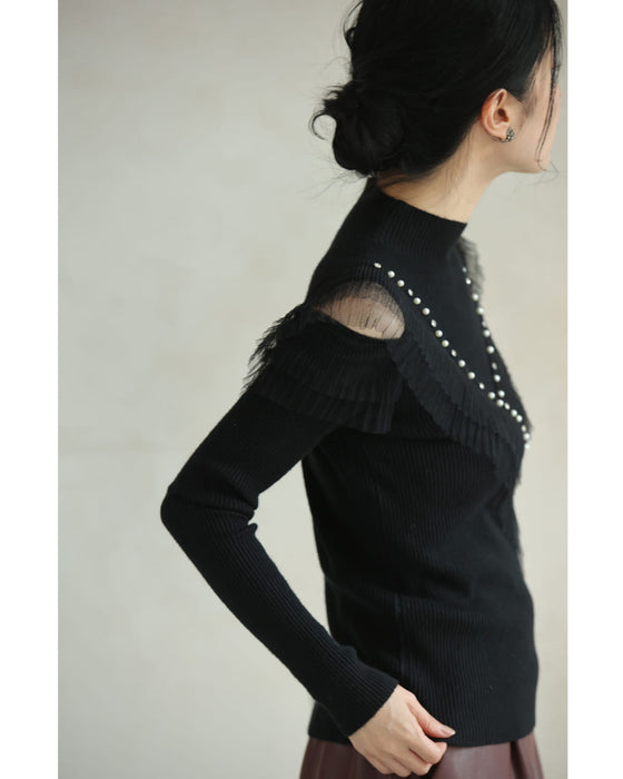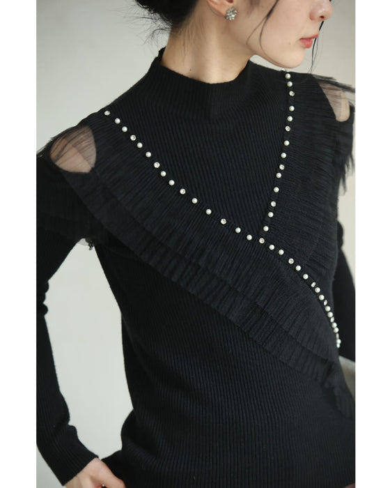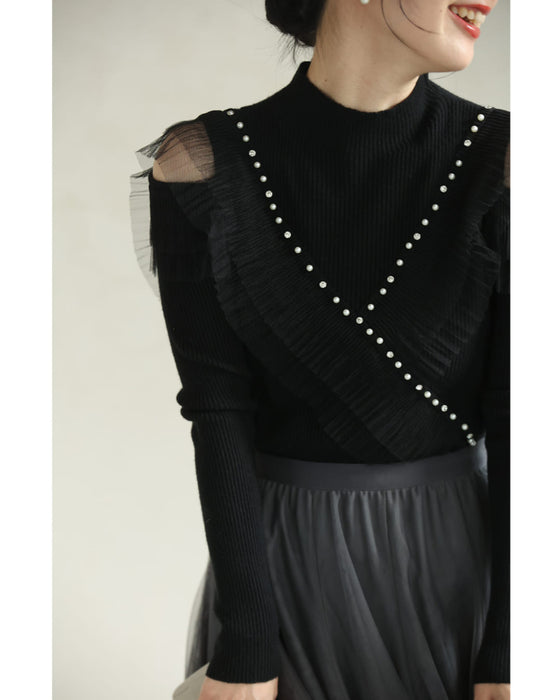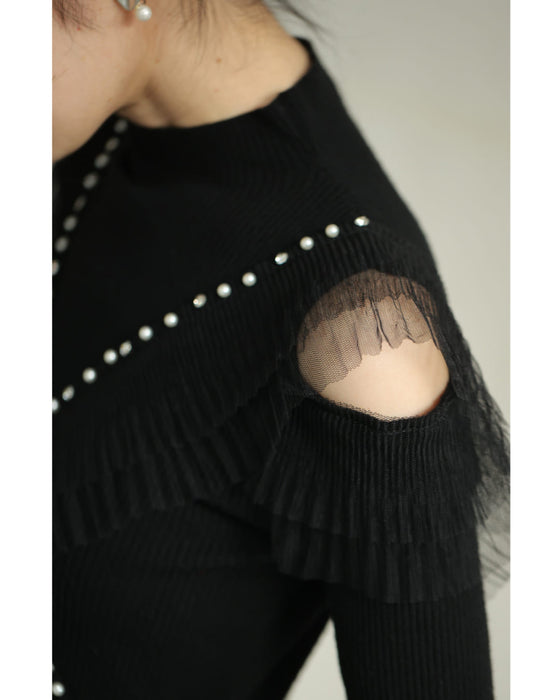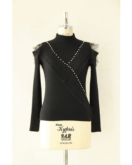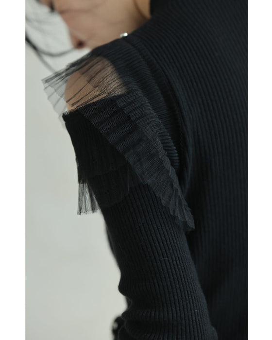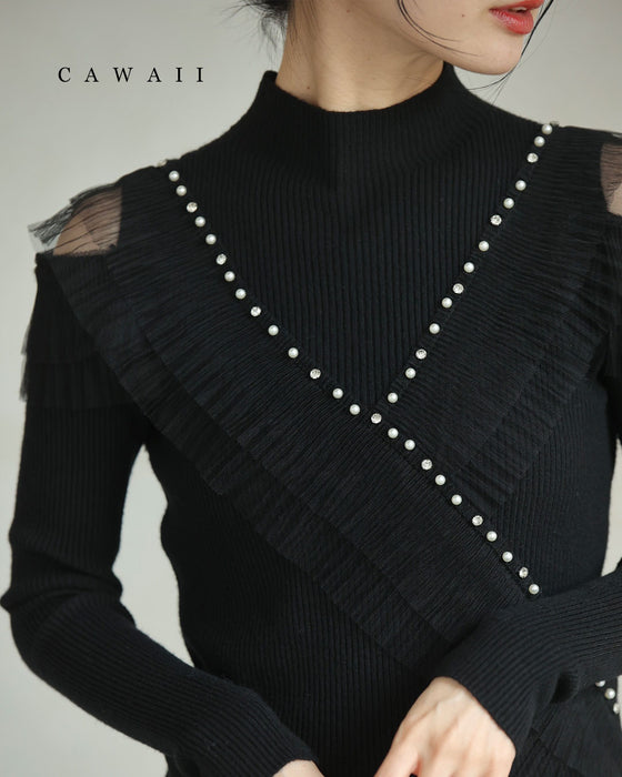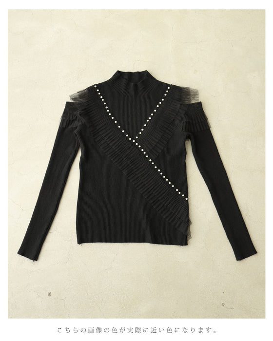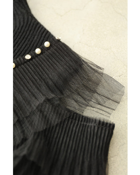 Ribbed knit cut-and-sew top with overlapping tulle ruffles and jewels