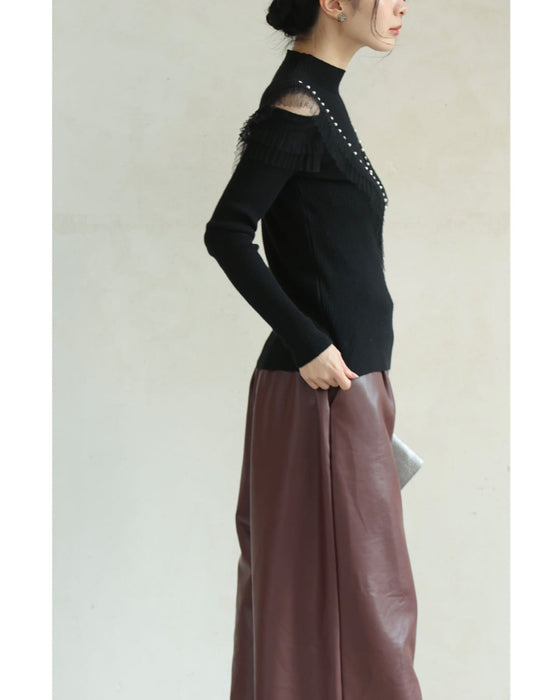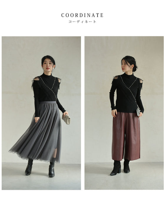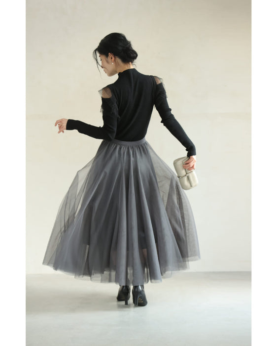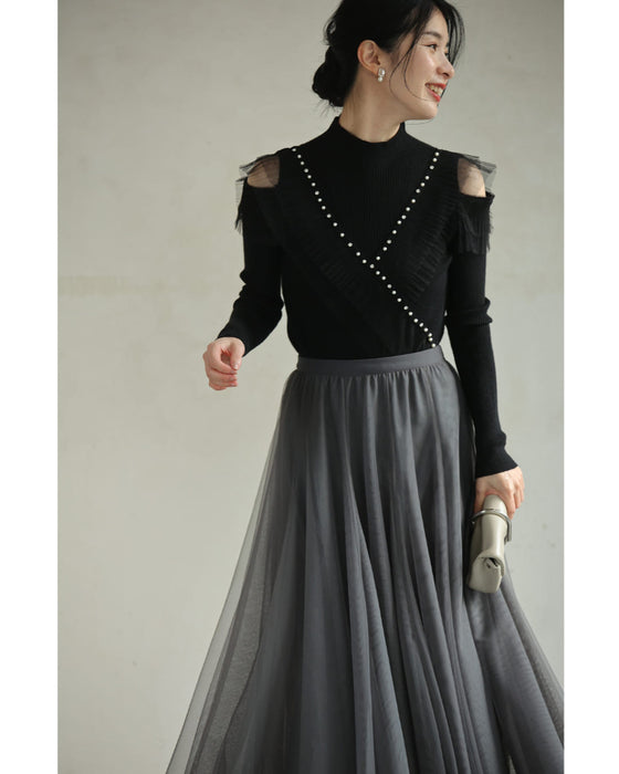 ■ Use of different materials, tulle and knit <br> The sheer material creates an elegant, airy look with an accent of tulle that brings out femininity. The contrast between the tulle and knit makes for an eye-catching design.