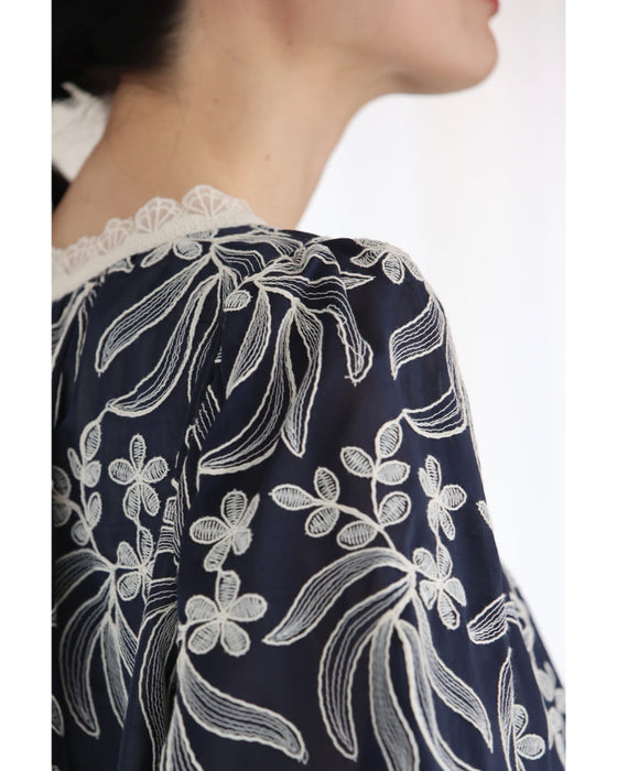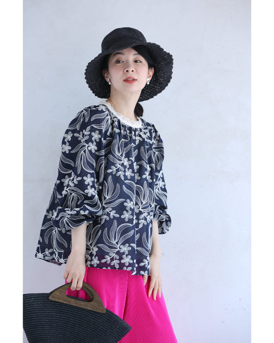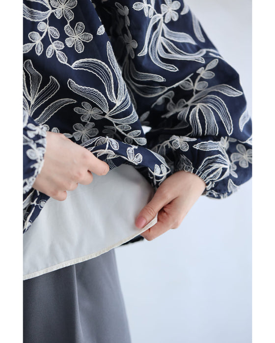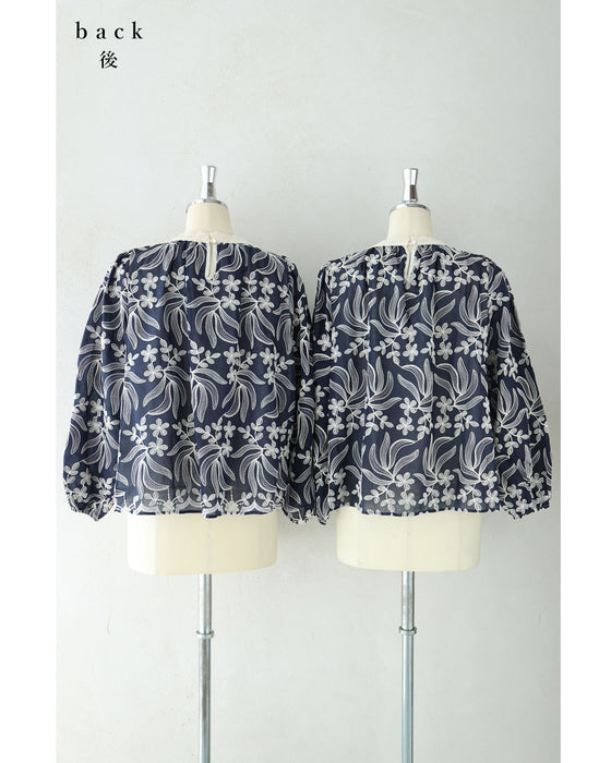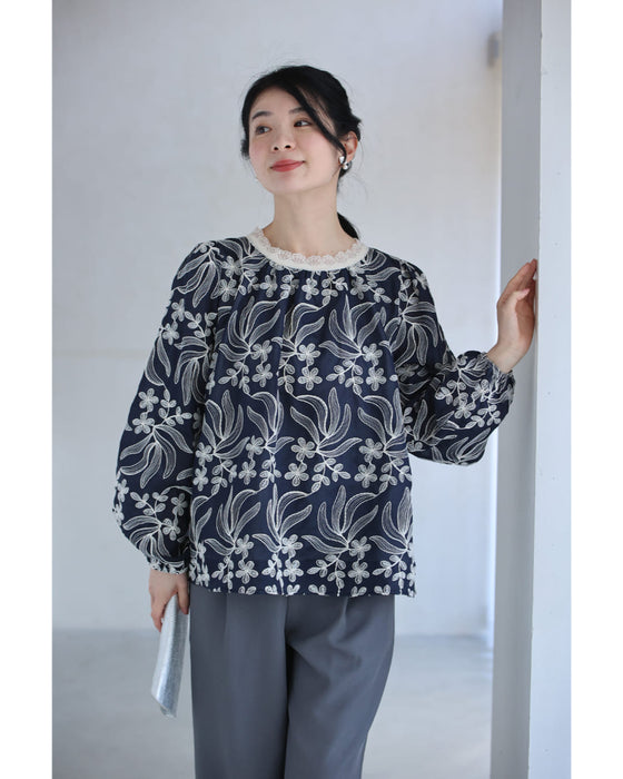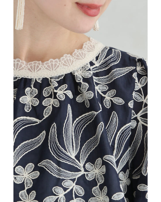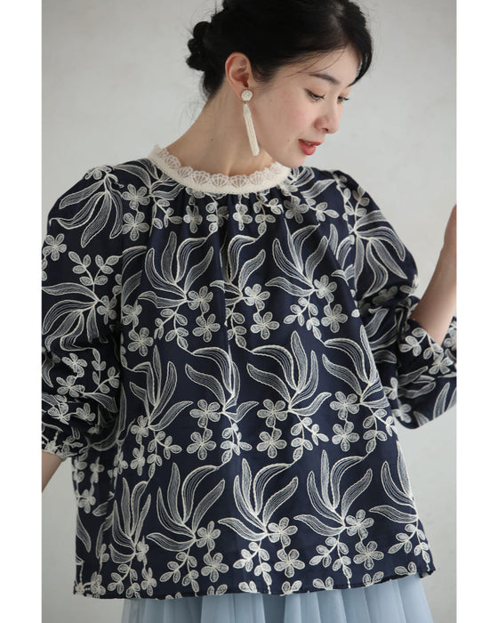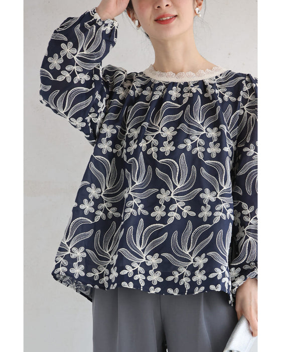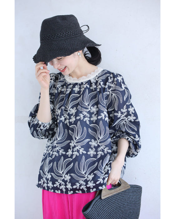首元を飾るシェルレースの白花刺繍ブラウストップス