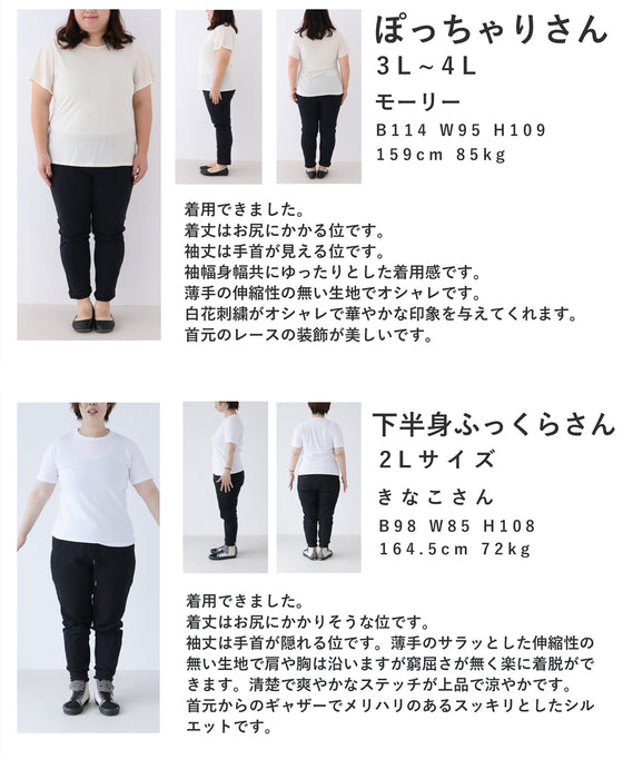 落ち着きのある色味に花柄刺繍が清楚で清潔感があります。ふんわりシルエットが体型を拾いにくく、動きやすく体型カバーが叶います。