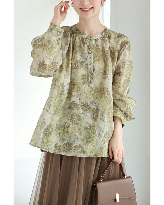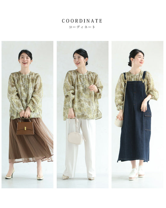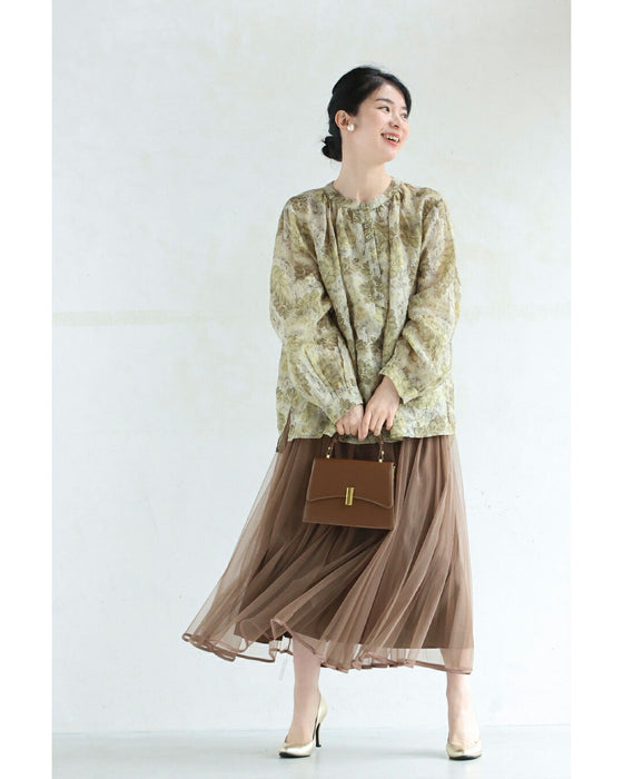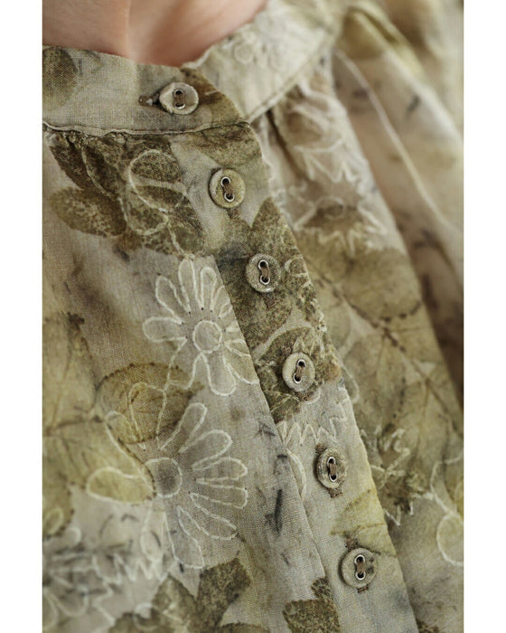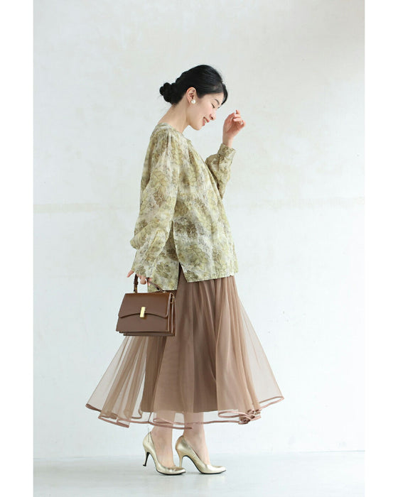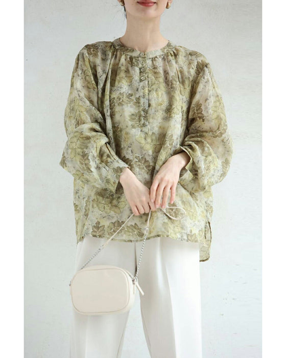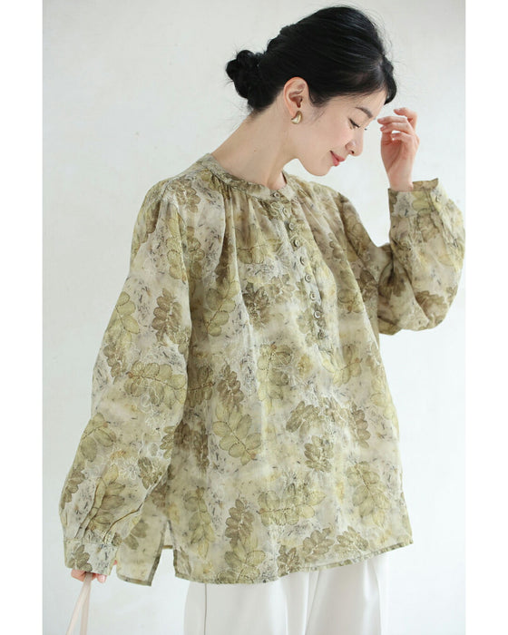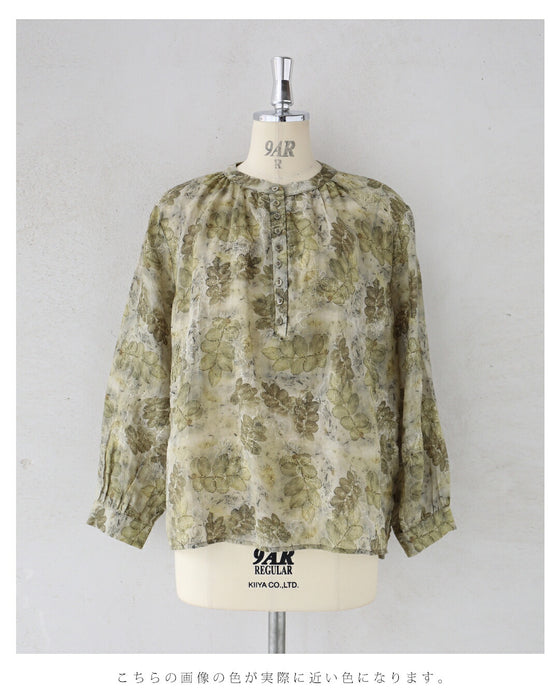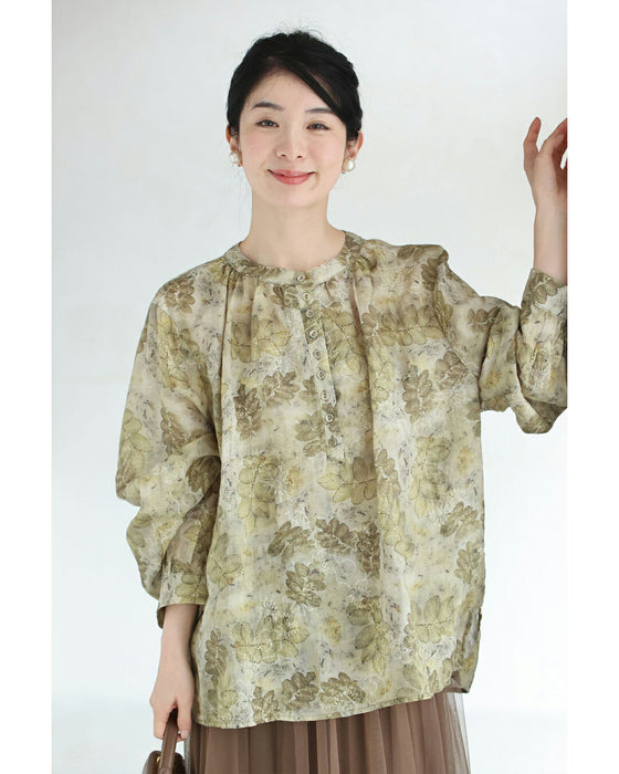 • くったり柔らかな花刺繍浮かぶリーフ柄ブラウストップス