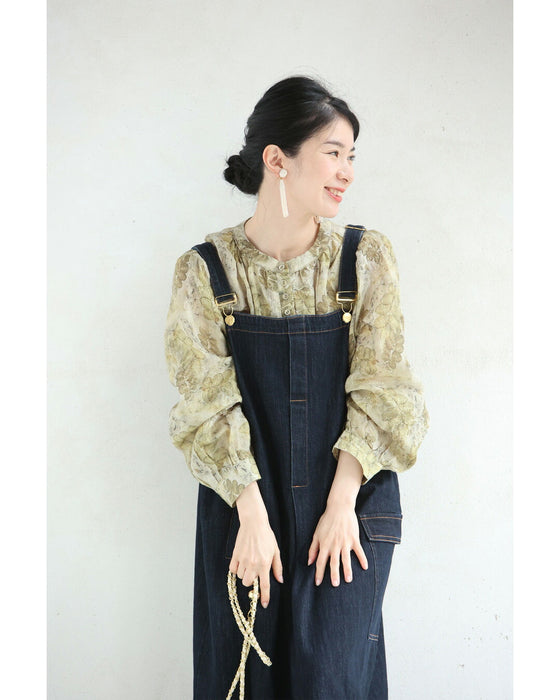 くったり柔らかな花刺繍浮かぶリーフ柄ブラウストップス