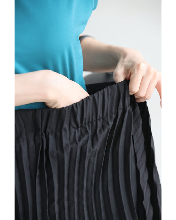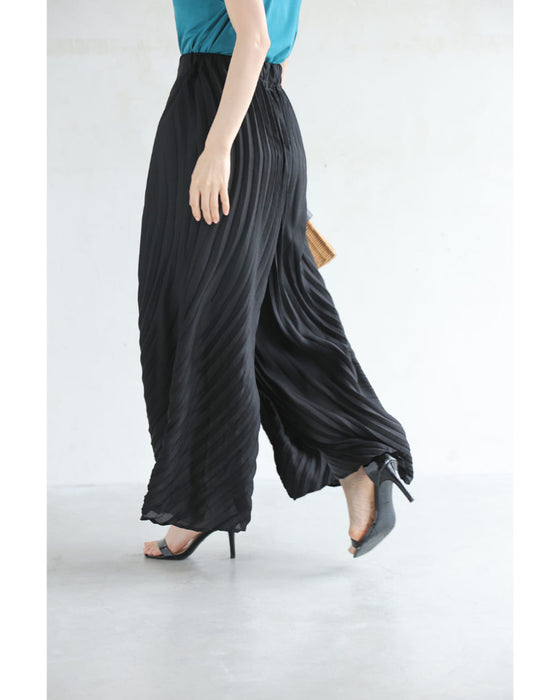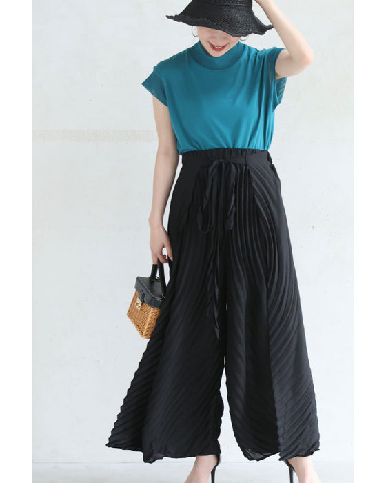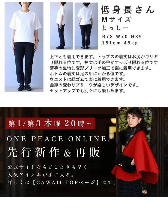 柔らかい素材で伸縮性も抜群。動きやすさを兼ね備えており、長時間着てもストレスを感じにくいのが嬉しいポイント。プリーツデザインが縦のラインを強調し、スタイルアップ効果も期待できます。さらに、ラップ風デザインのパンツは腰回りを美しく見せてくれ、女性らしいシルエットを演出。