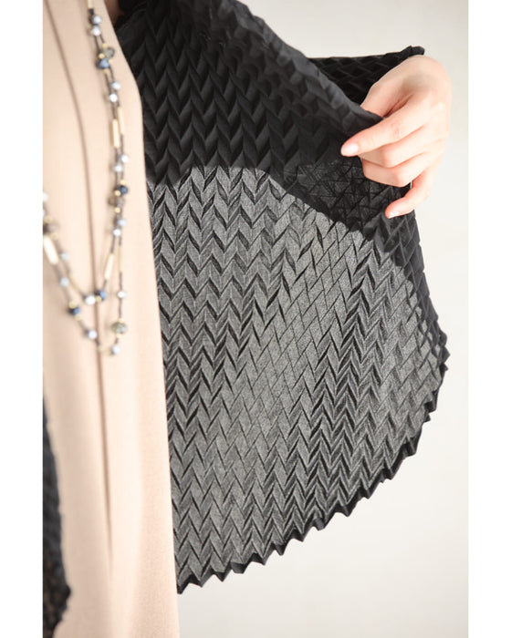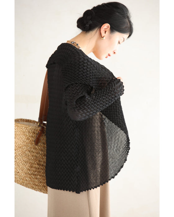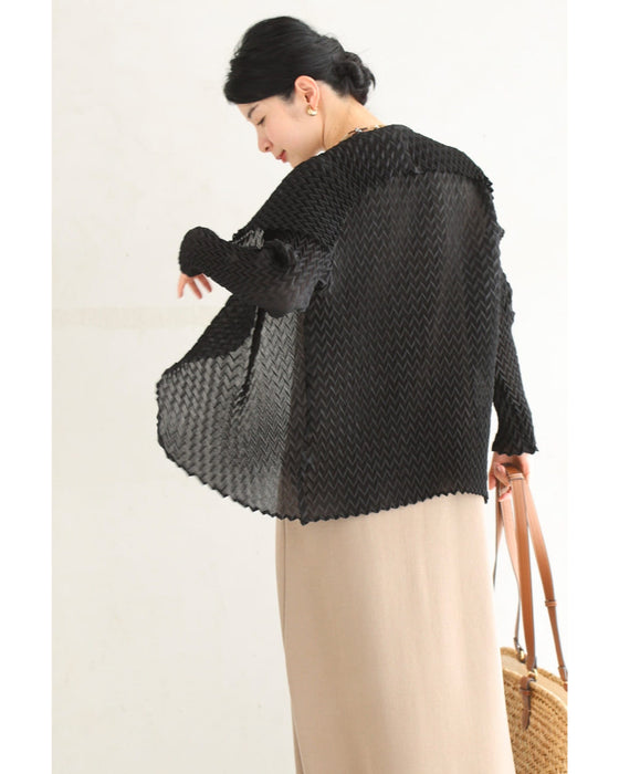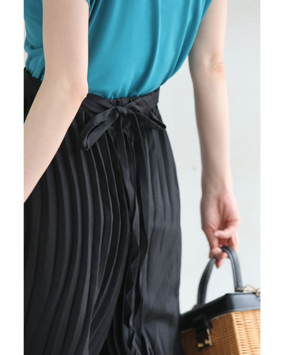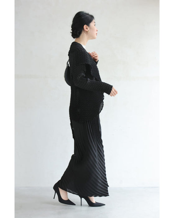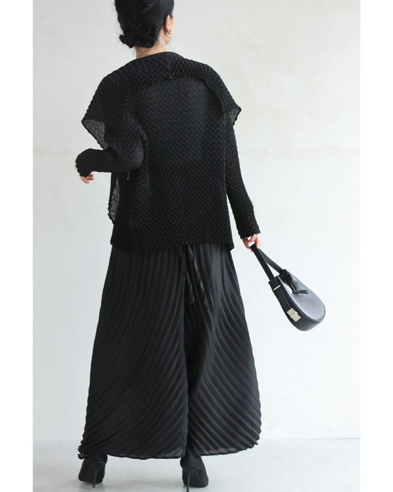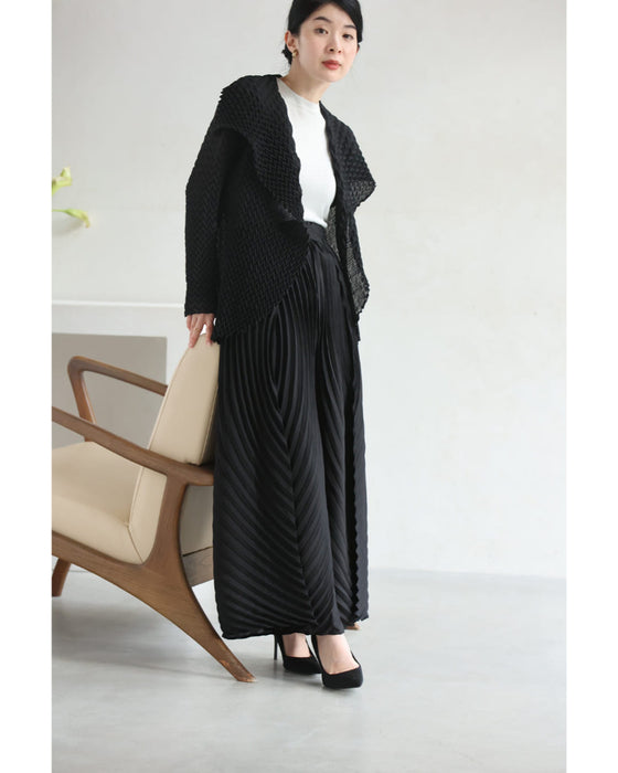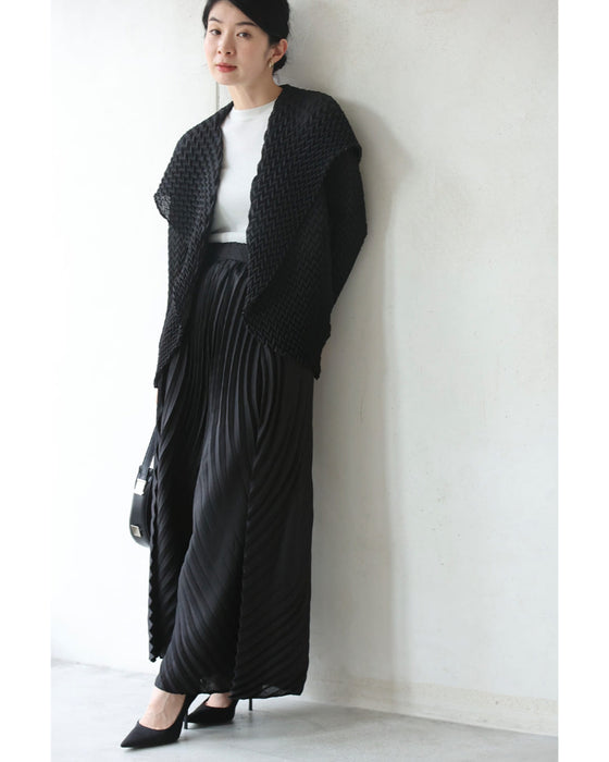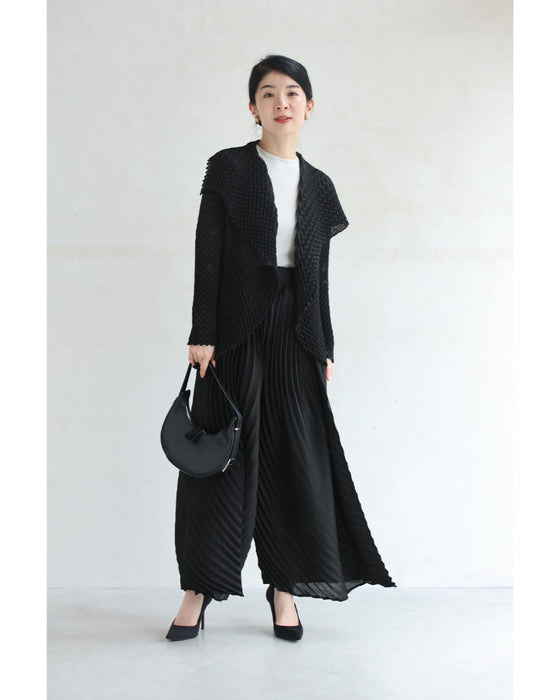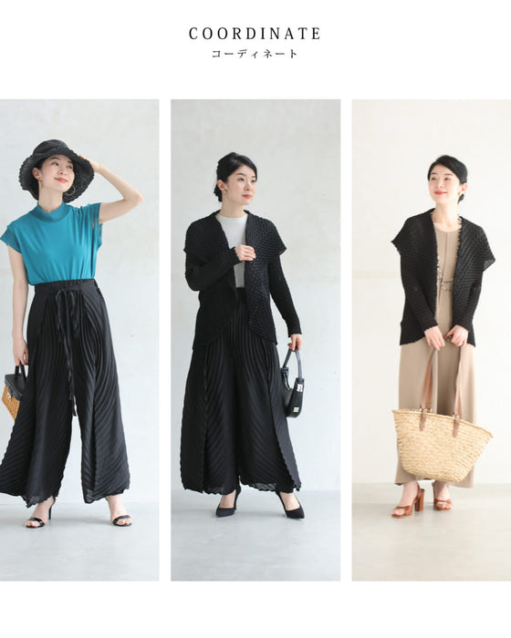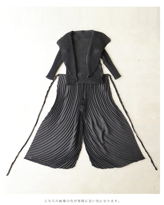 立体感のあるデザインプリーツカーディガンと、エレガントなラップデザインパンツがセットになった、洗練されたスタイルを叶える2点セット。プリーツの陰影が美しく、シンプルながらも存在感のある仕上がりになっています。これ一つでこなれ感のある大人のコーデが完成し、特別なコーディネートを考えなくても、サッと羽織るだけでスタイリッシュな印象に。