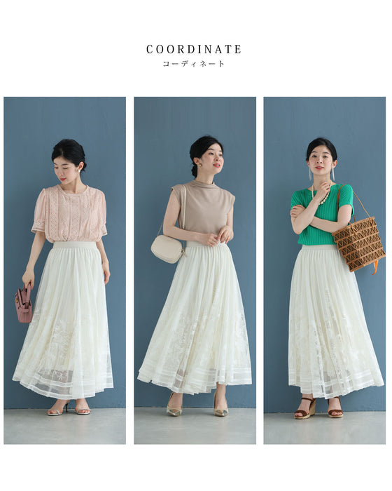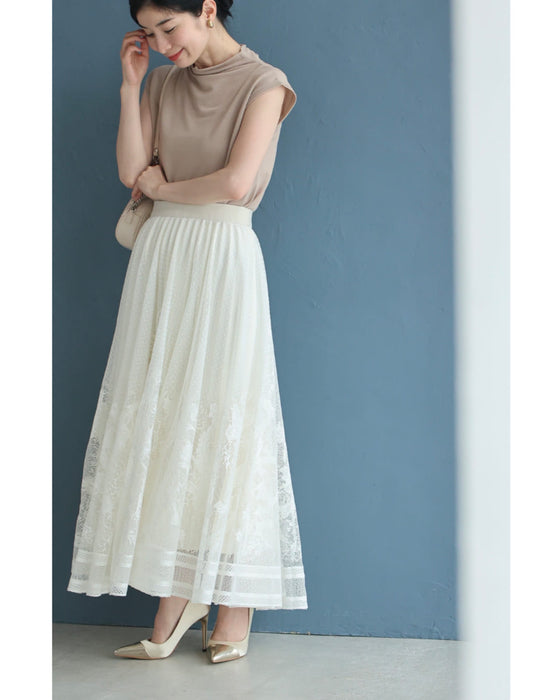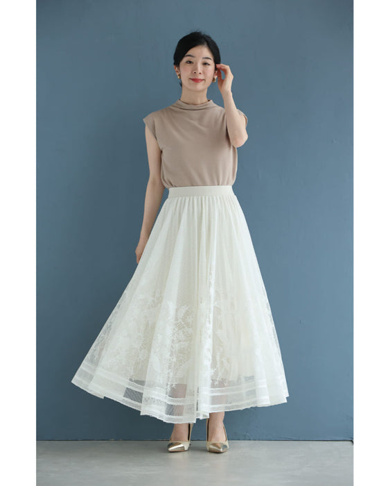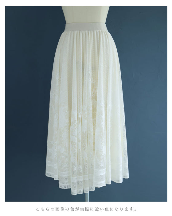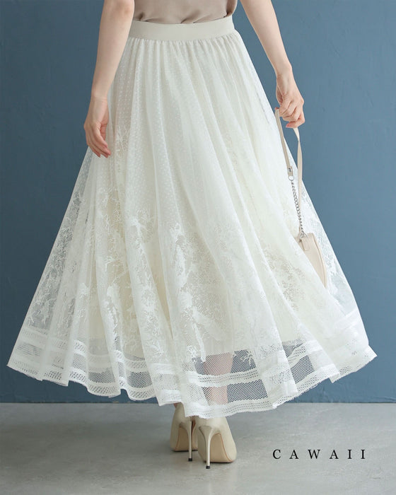 たっぷりと贅沢に生地を使い、裾にかけてふんわりと広がるレースロングスカート。