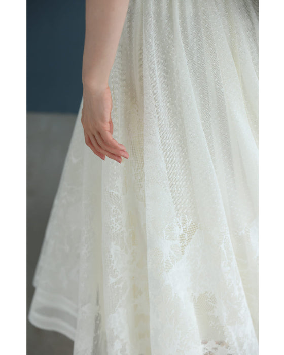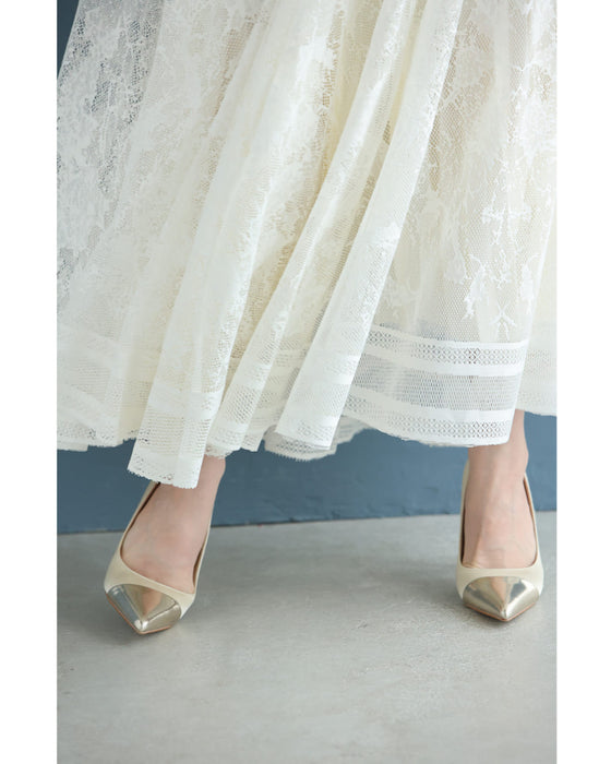内側には、光沢感のあるプリーツインナーを仕込むことで、レース越しに艶やかな陰影がちらりと覗き、動きに合わせて上品なきらめきを演出します。心がときめくような美しさを一枚に込めた、大人のワードローブにふさわしい主役スカートです。