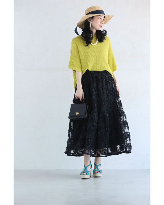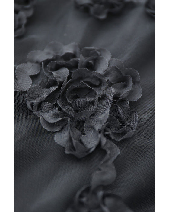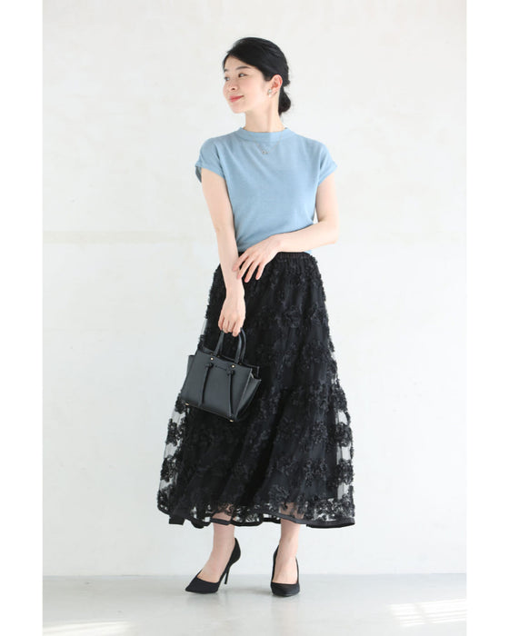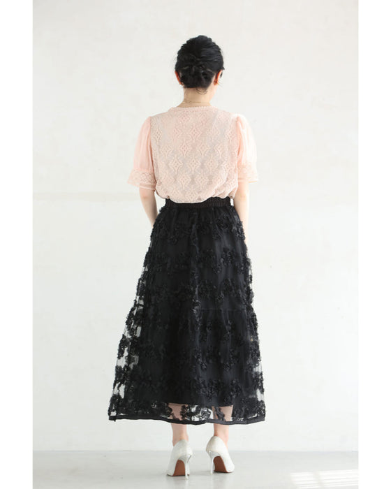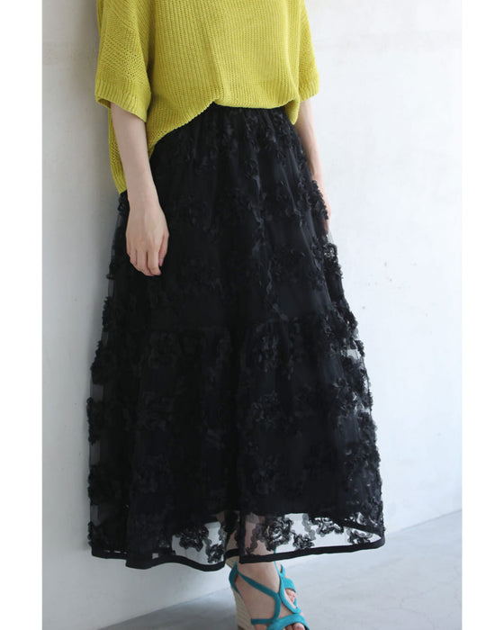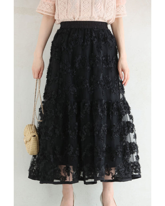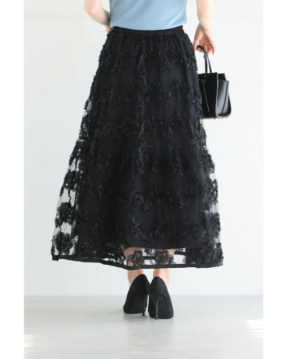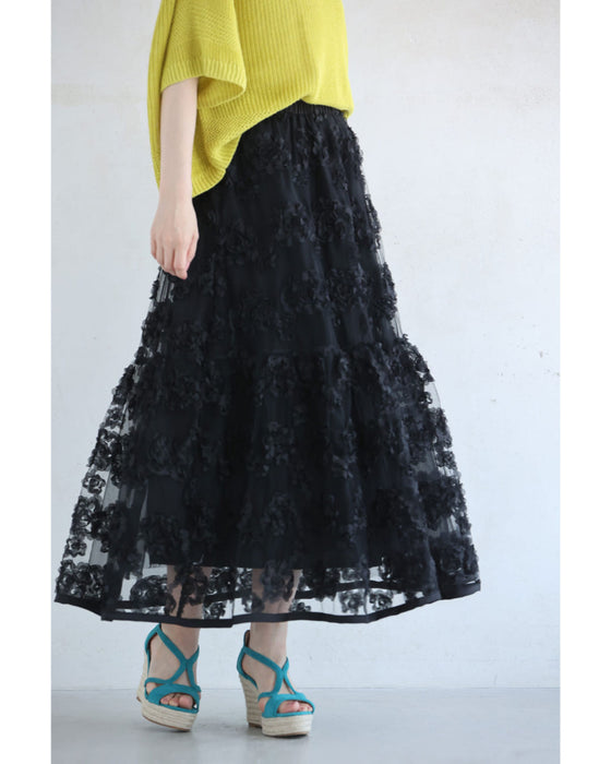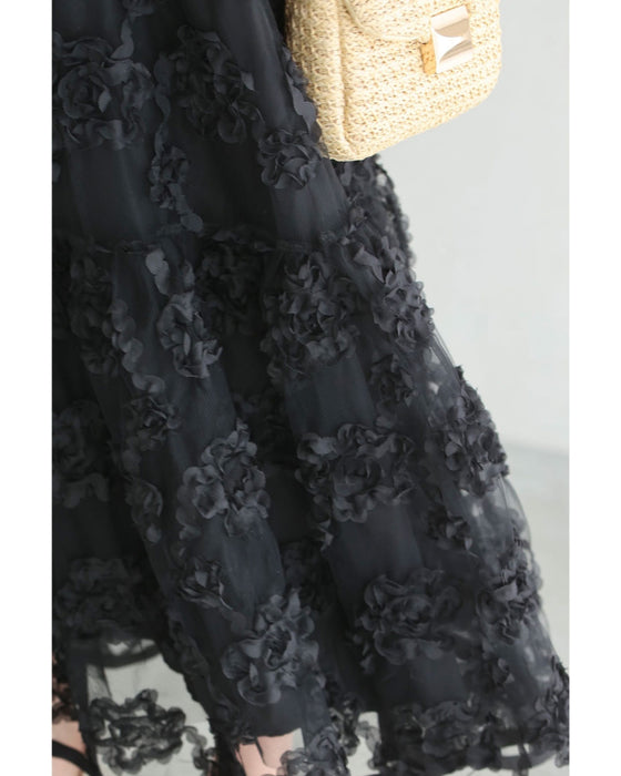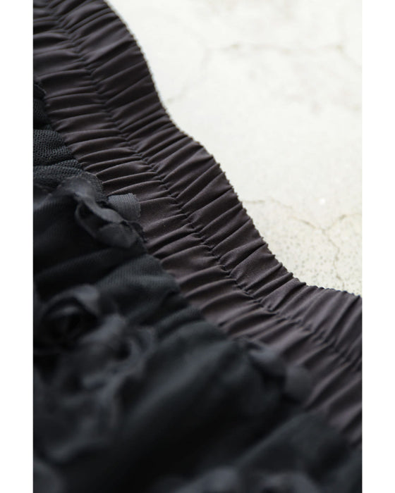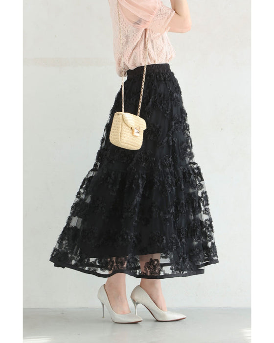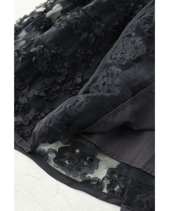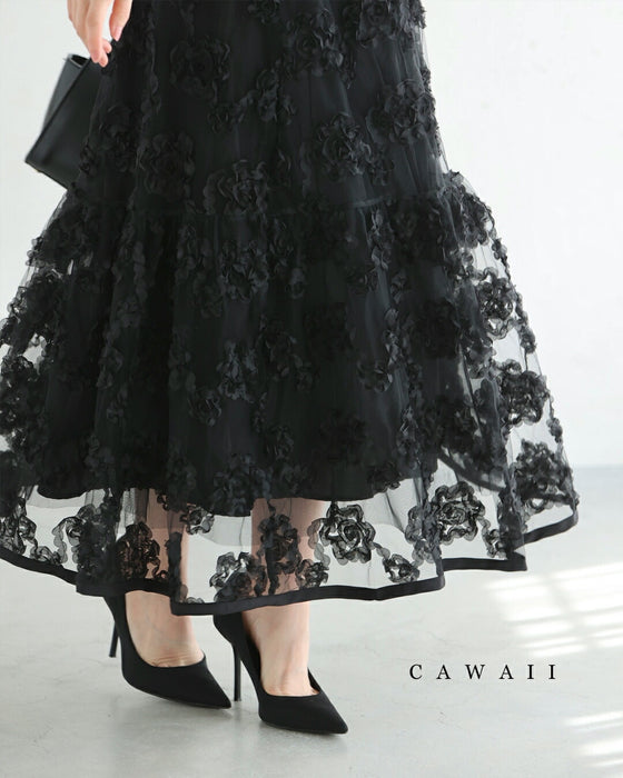 二層構造のチュールが奥行きのある表情を生み出し、歩くたびに軽やかに揺れて視線を引きつけます。シックな黒をベースにすることで、甘さを抑えつつも上品で洗練された印象に。ふわふわと浮かぶように配置された花のディテールが女性らしさを引き立て、特別感のある着こなしに。