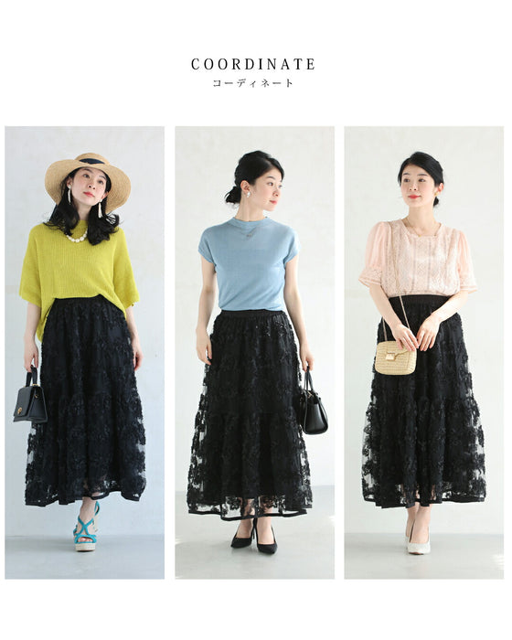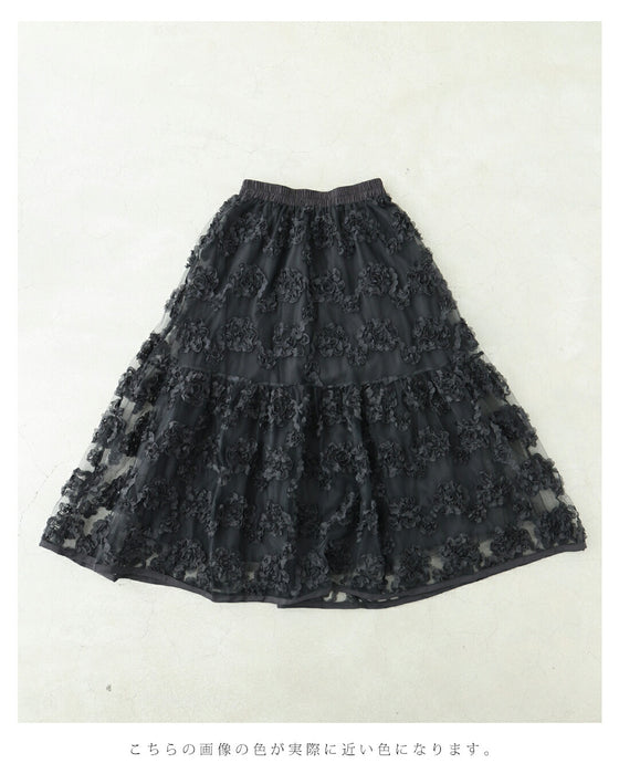 ふわふわと花が浮かぶ2重チュールミディアムスカート