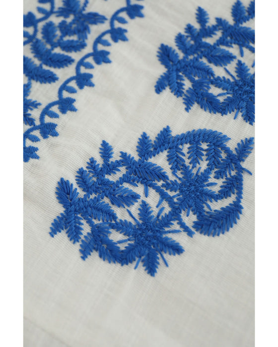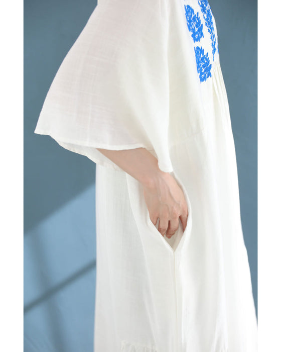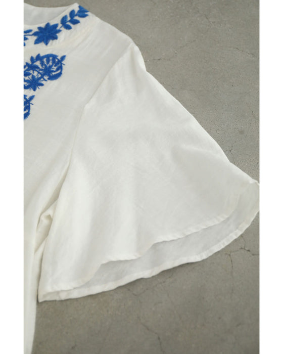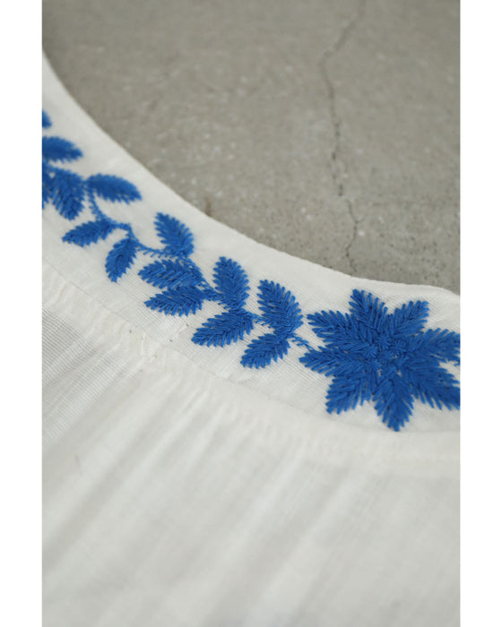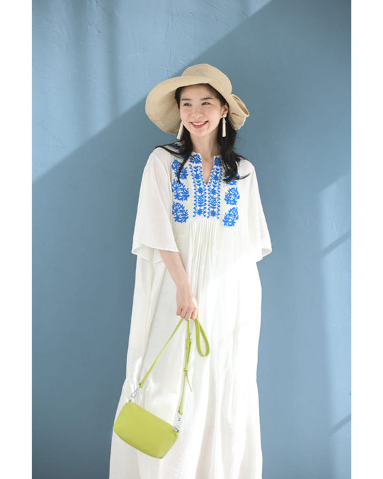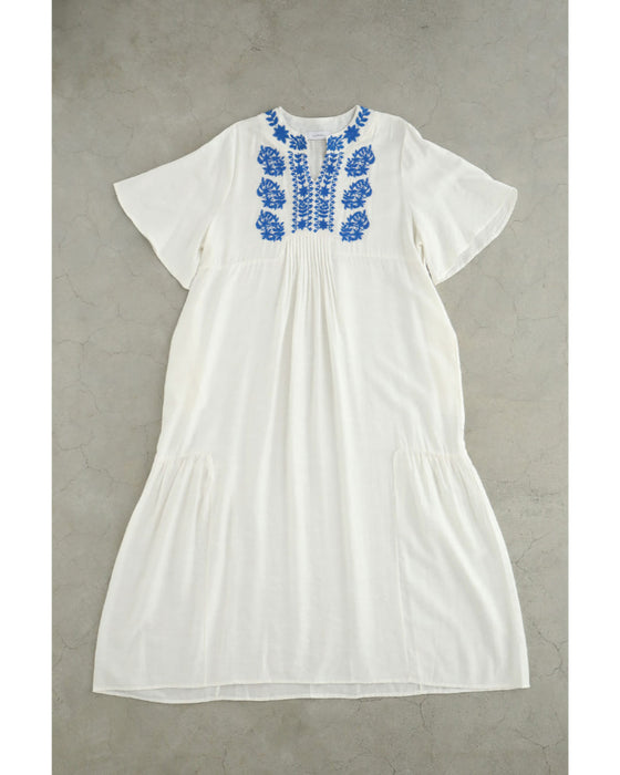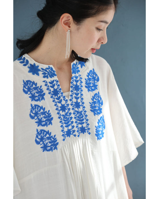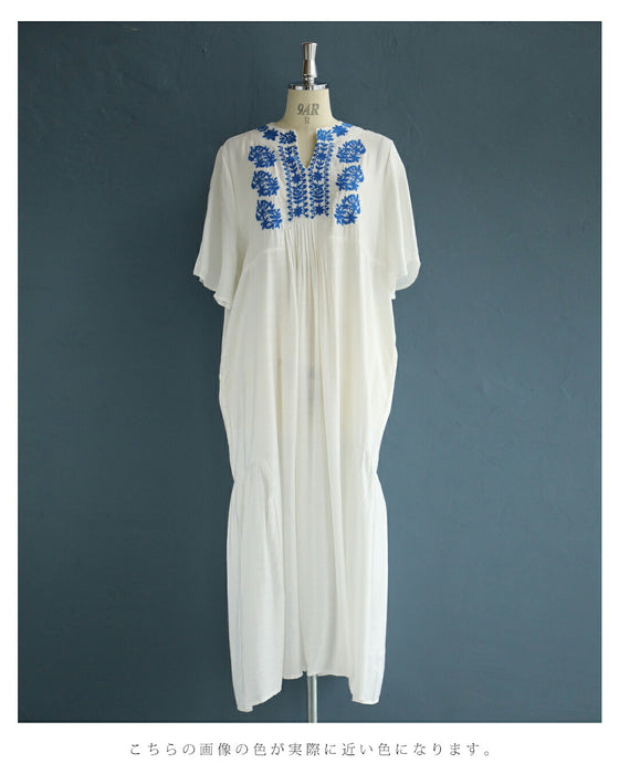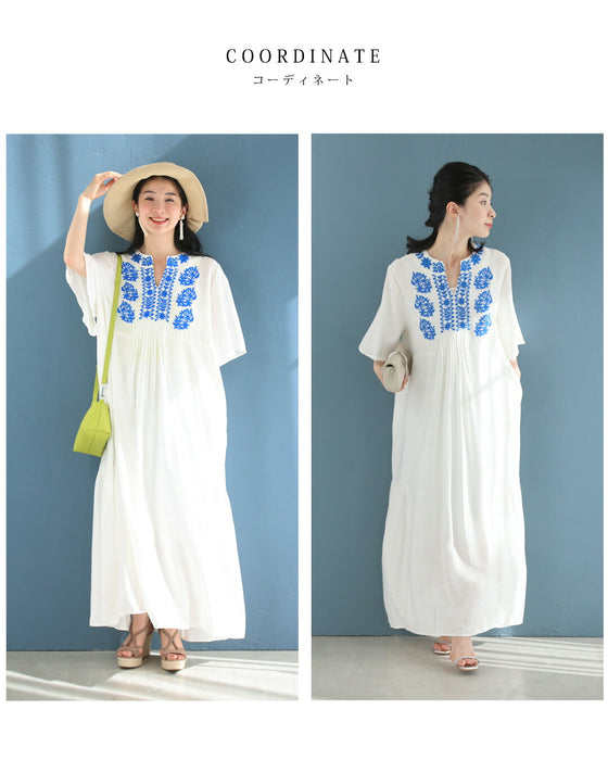 まるで南国の風を纏うような、涼やかで華やかな刺繍ロングワンピース。顔まわりを彩る繊細なブルーの刺繍が印象的で、着るだけで気分が上がる一枚です。