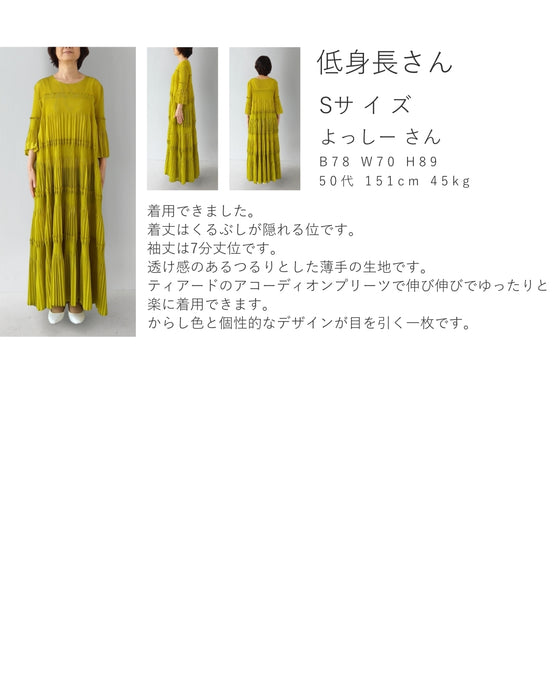 段ごとに切り替えを入れることで、立体感のあるふんわりとしたフォルムを実現し、体のラインを拾わず自然にカバー。締め付け感のないゆったりとしたシルエットながら、広がりすぎず大人らしいバランスに仕上がっています。