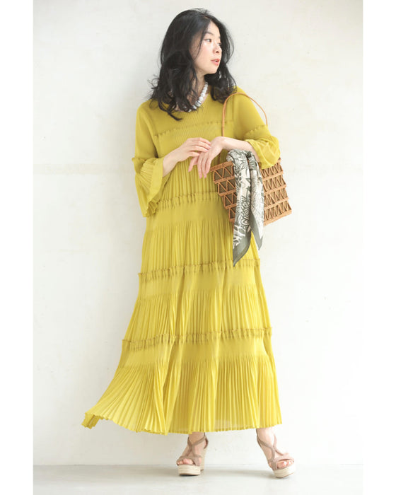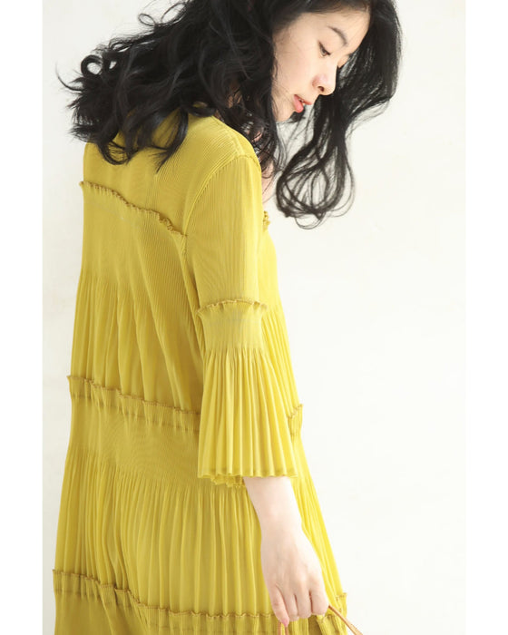 軽やかで透け感のある素材は、風を受けてやさしく揺れ、まるで空気をまとうような軽快な着心地。特に袖部分まで入ったプリーツが、腕まわりもすっきり見せつつ、女性らしい優しさを演出してくれます。
