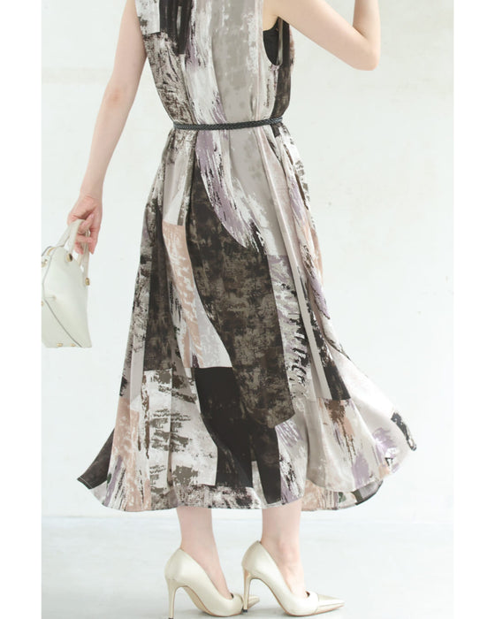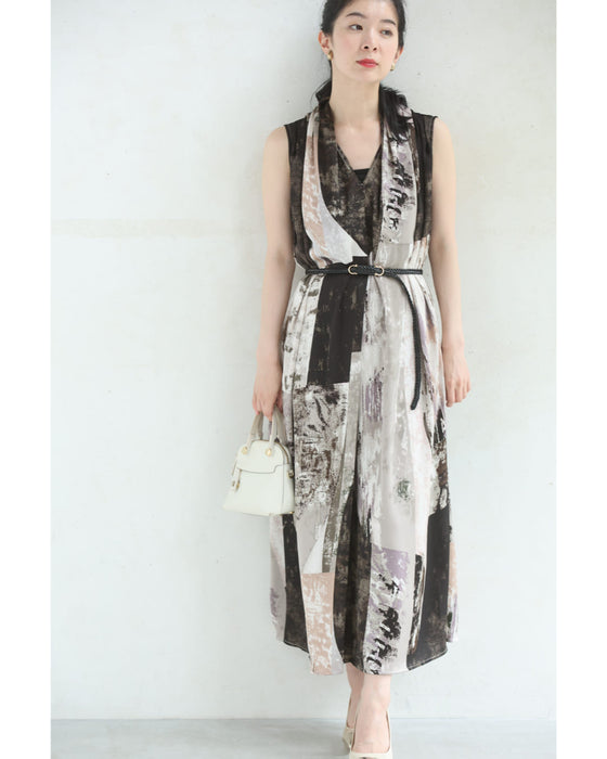 ホルターネック風ドレープのモード柄ミディアムワンピース(ベルト付き)