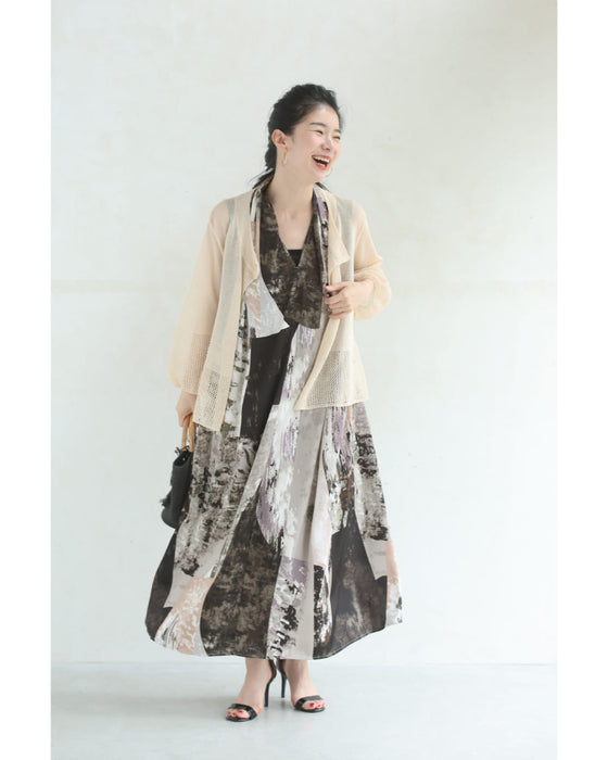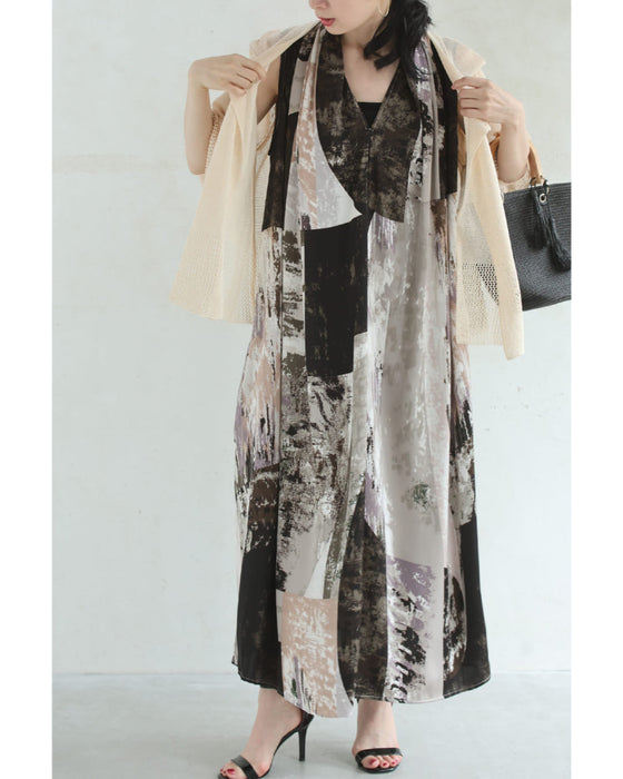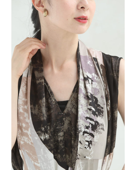 ストールを巻いているかのような立体的なネックデザインが、顔まわりを華やかに演出。落ち感のある生地とアート柄が調和し、洗練された大人の装いに。