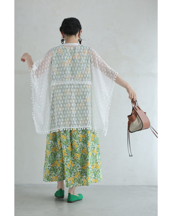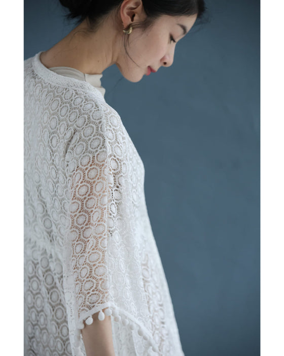 総レース仕立ての美しいデザインが、羽織るだけで華やかな印象に。サークル模様の透け感が夏らしく、軽やかな着心地を演出。