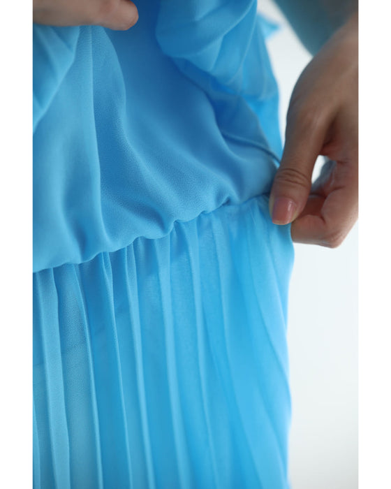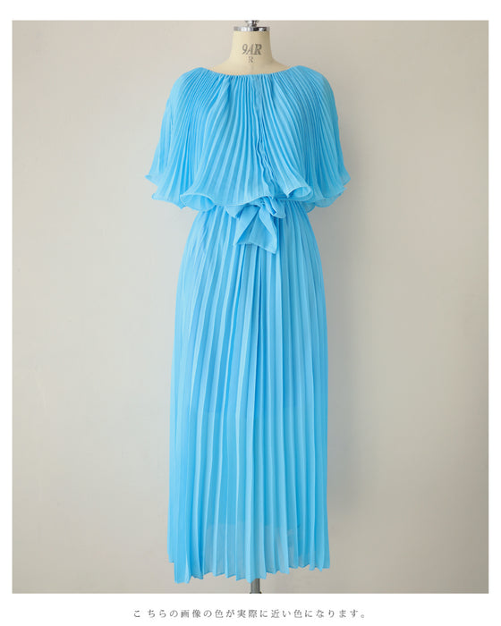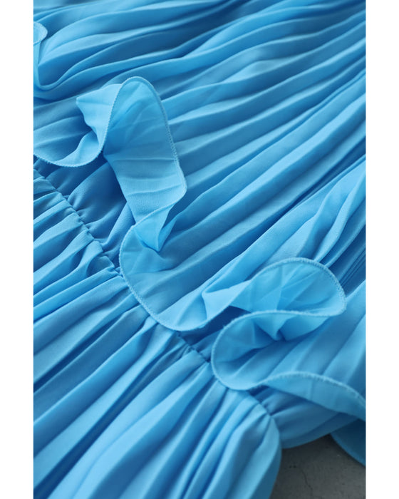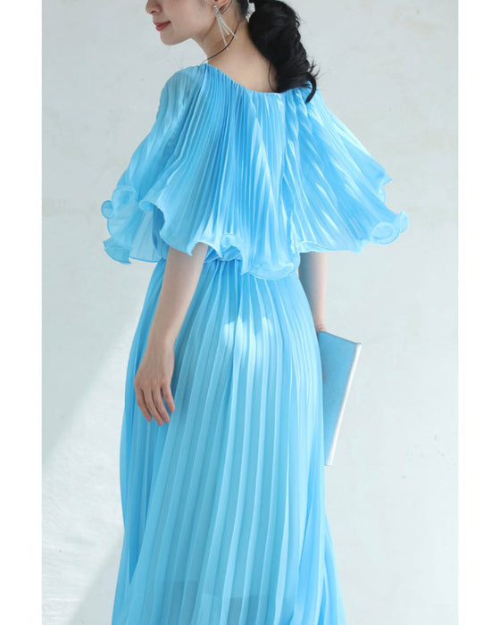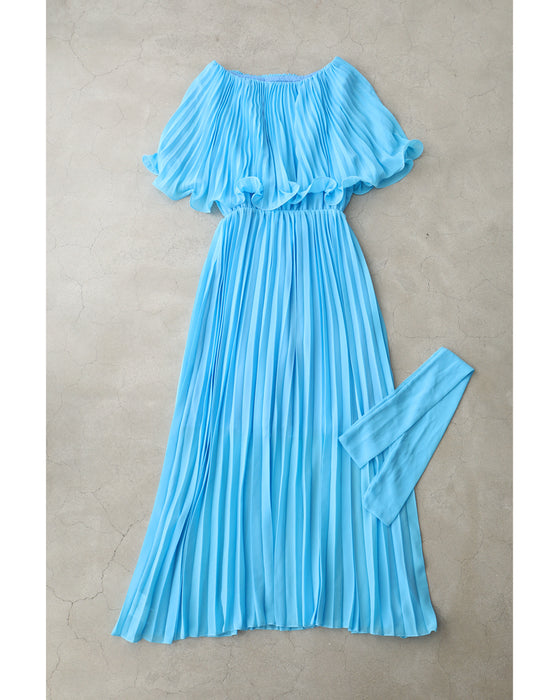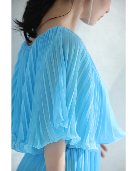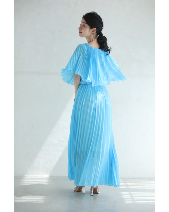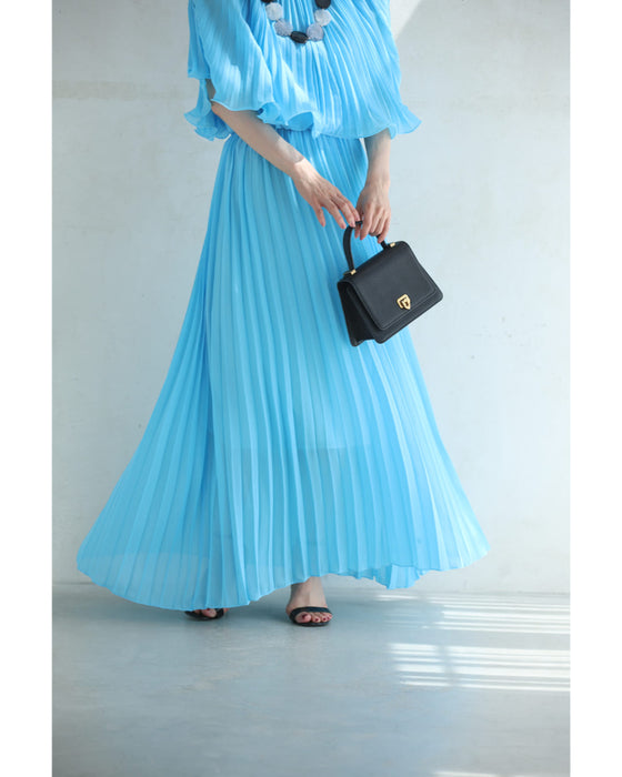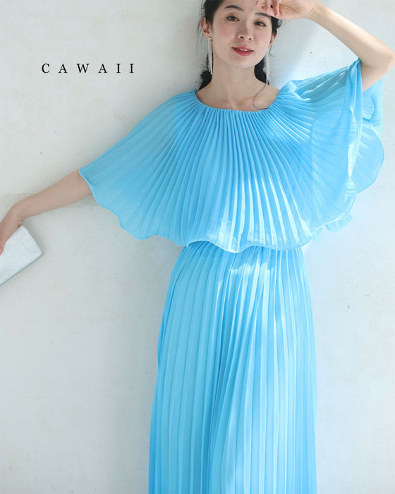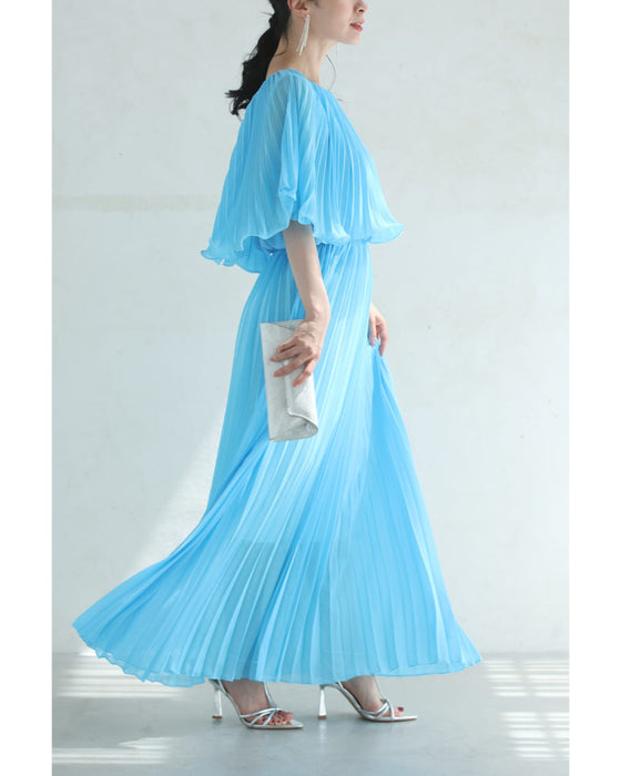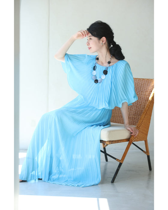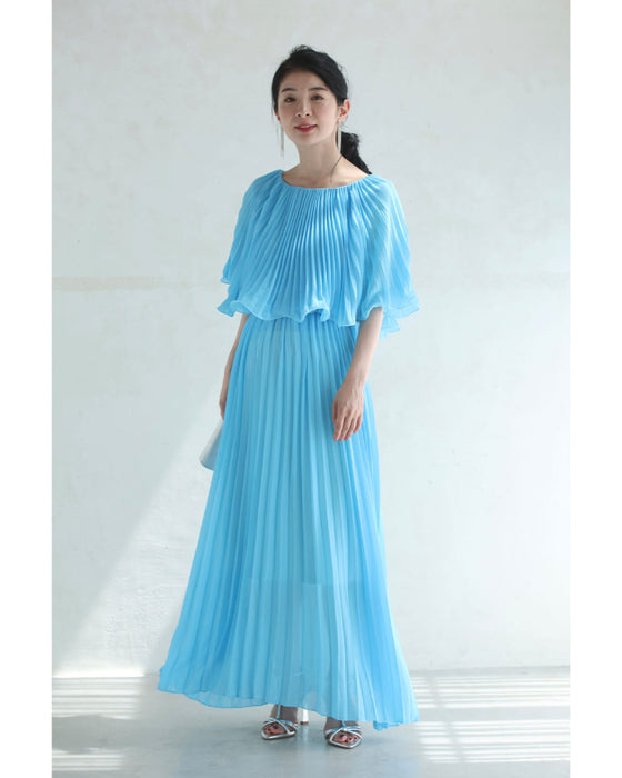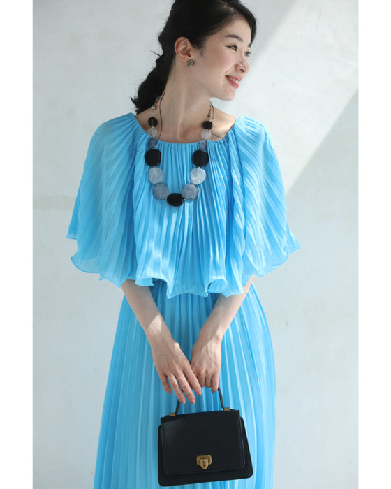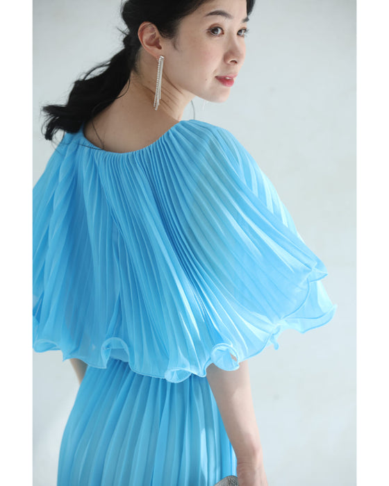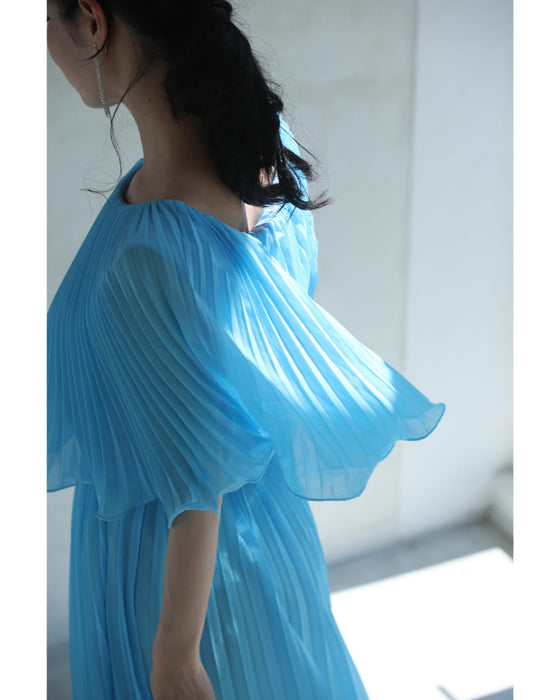 繊細なプリーツが動きに合わせてふわりと揺れるエレガントな一着。清涼感あふれるブルーが目を惹き、夏のお出かけやリゾートシーンにも映えるデザインです。