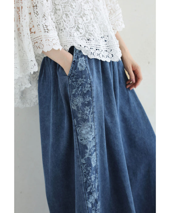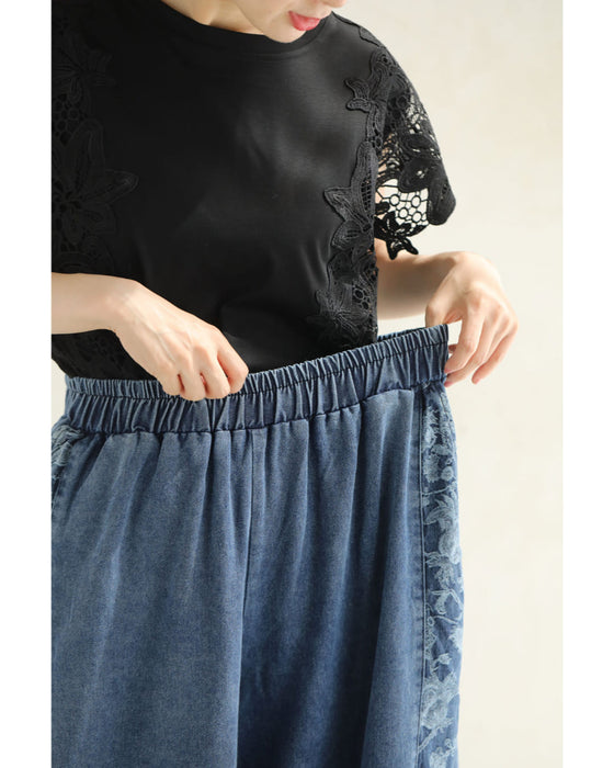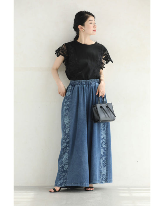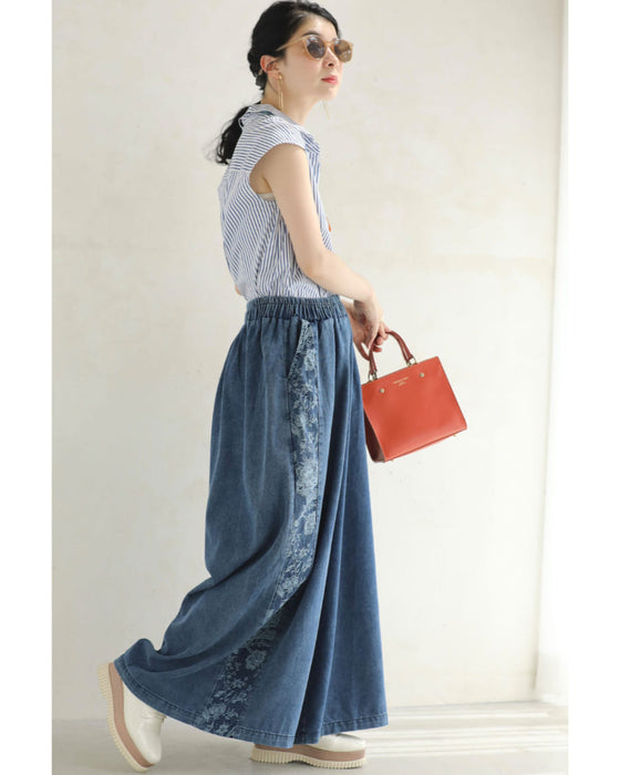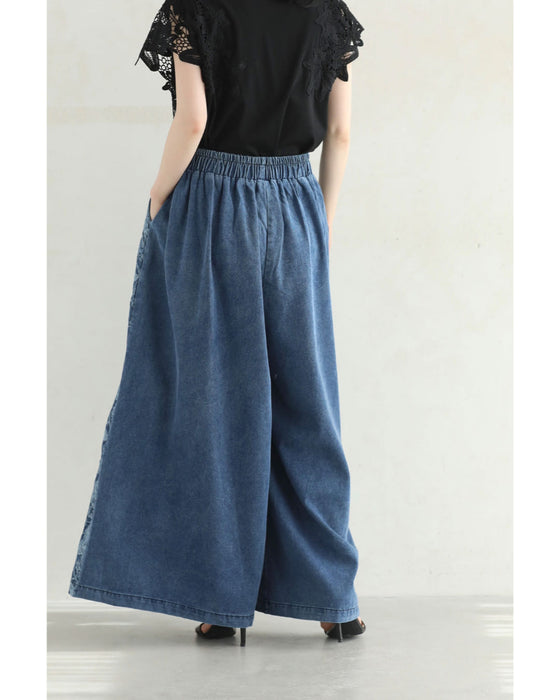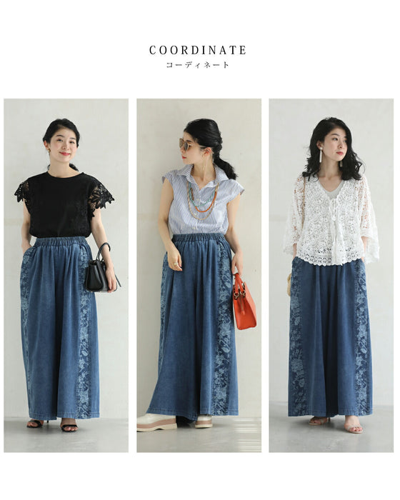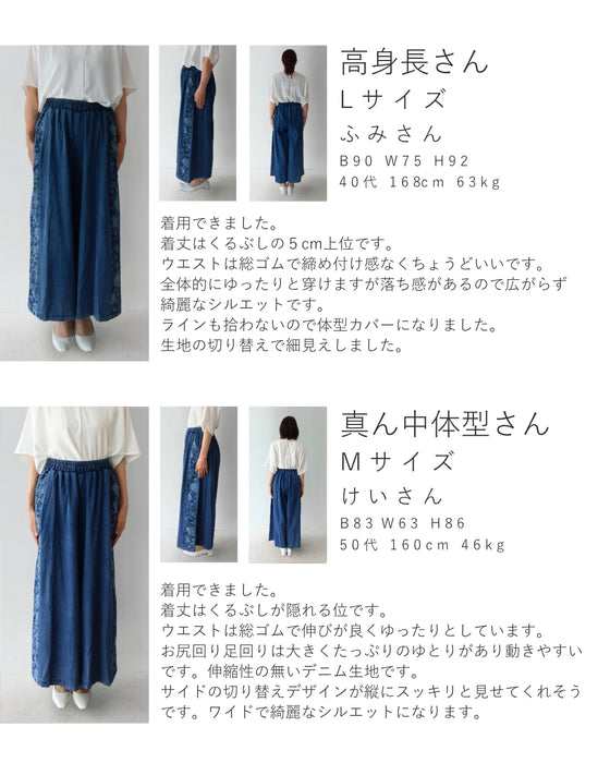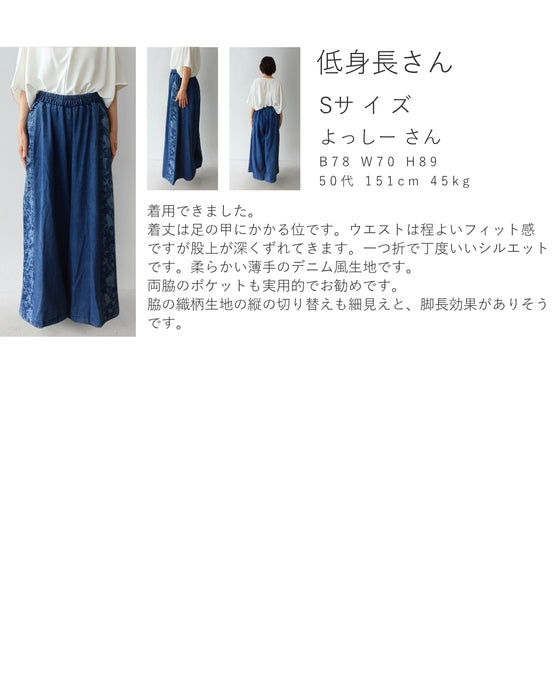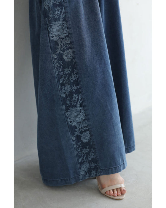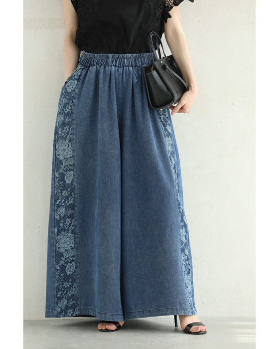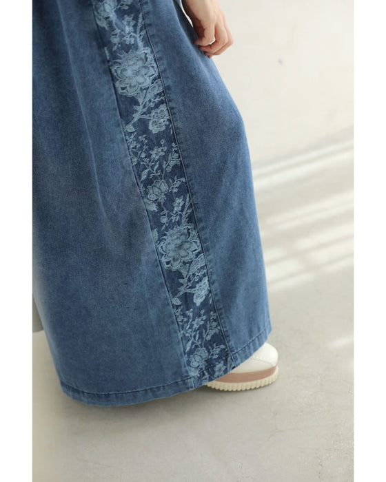 花の絵流れるサイドラインのゆったりワイドパンツ