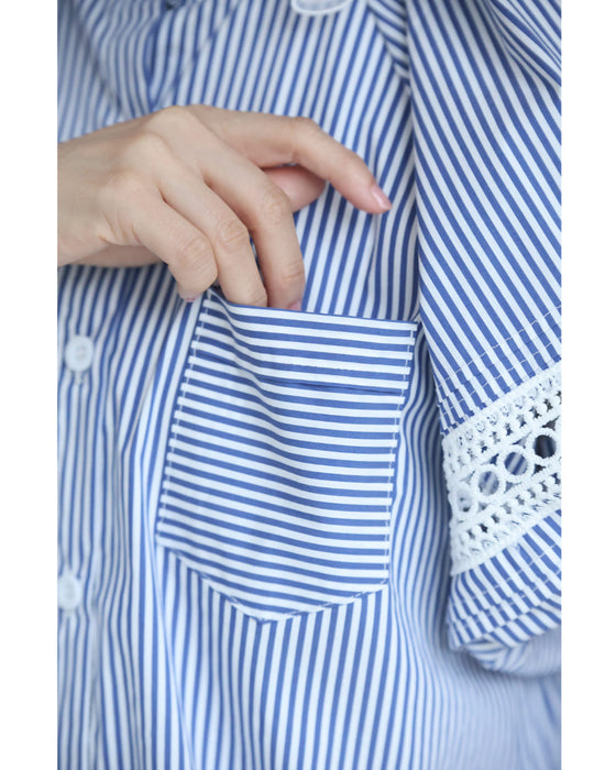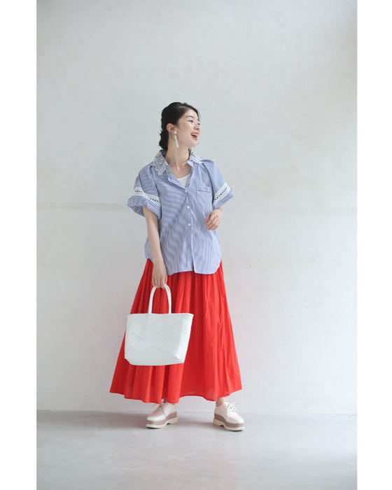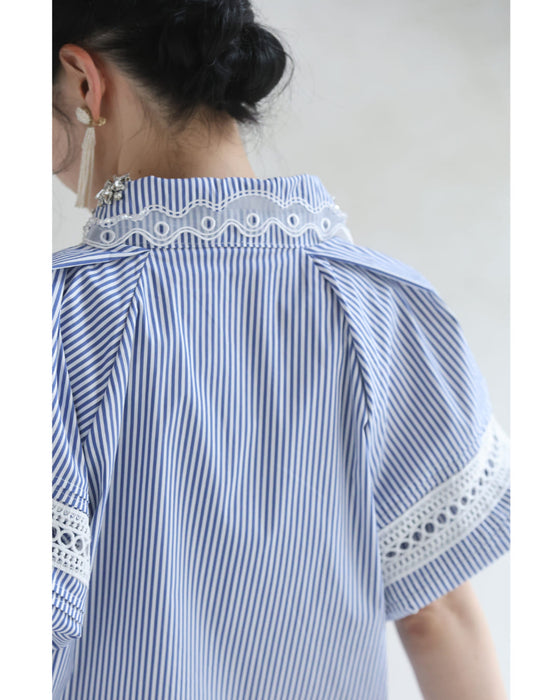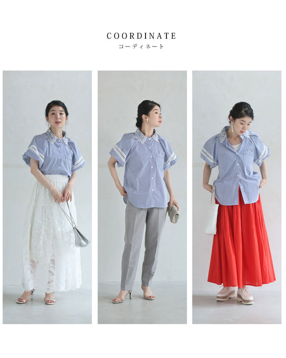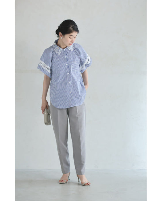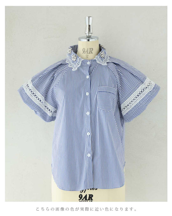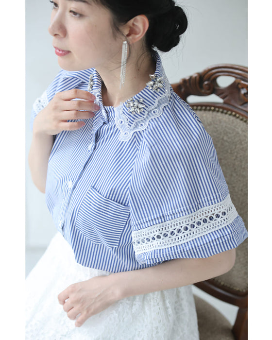 ベーシックなストライプ柄に、襟元のレース刺繍&ビジューを施してワンランク上の装いに。パンツにもスカートにも合わせやすく、通勤やお出かけなど幅広いシーンで活躍。