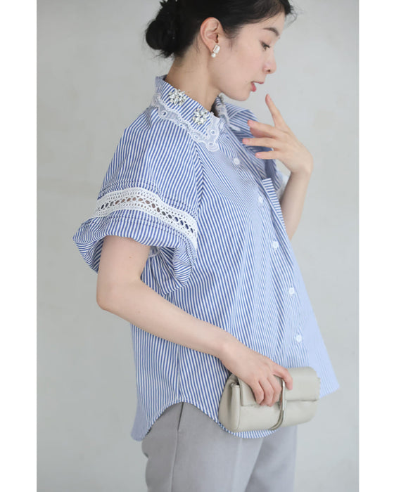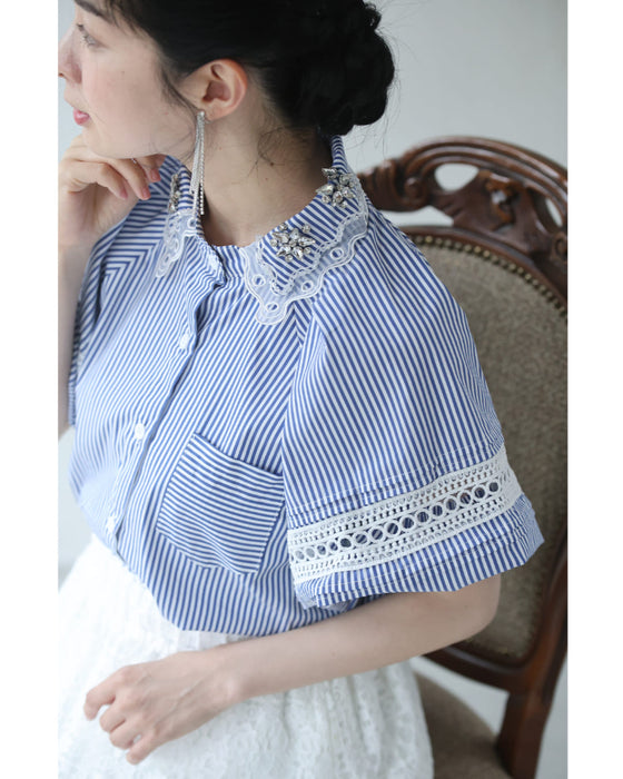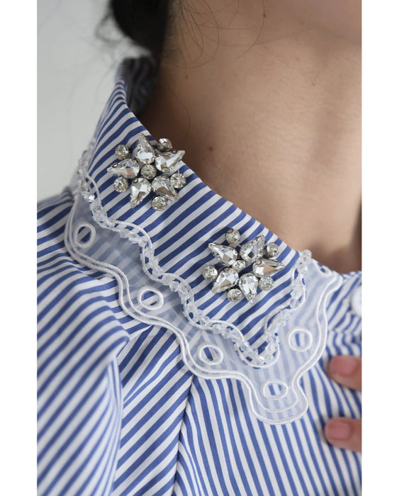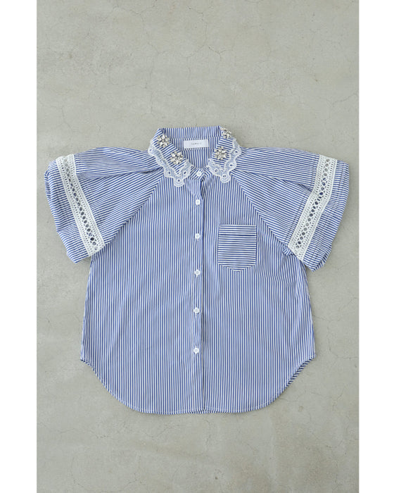 首元に輝くビジュー花襟のポワン袖ストライプシャツトップス