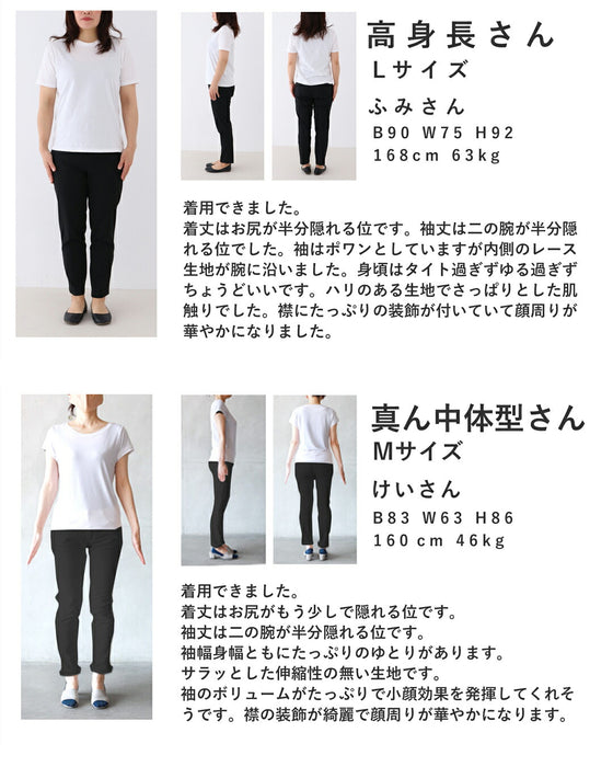 動くたびにふんわり揺れる立体袖で程よいハリ感のある素材とパターン設計で、二の腕を包み込むような立体スリーブが女性らしい印象に。