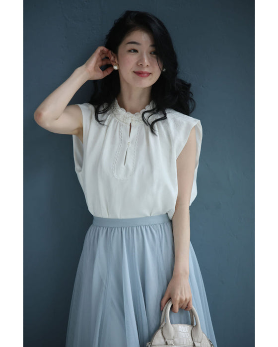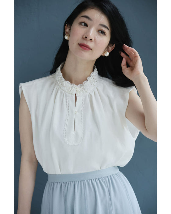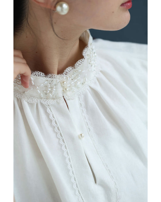 繊細な輝きを放つビーズ刺繍襟ブラウストップス