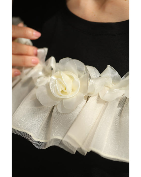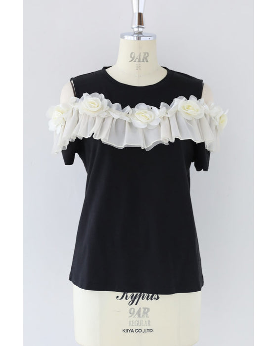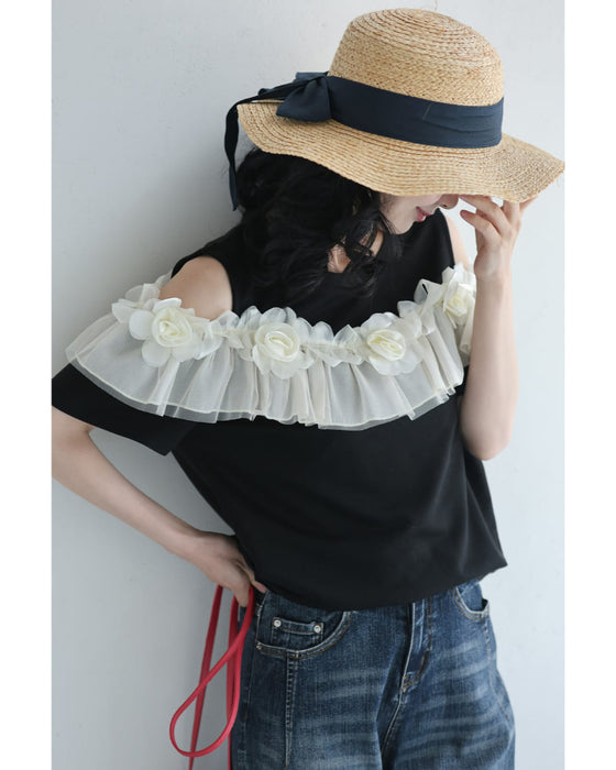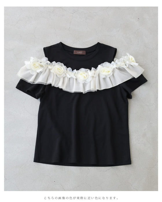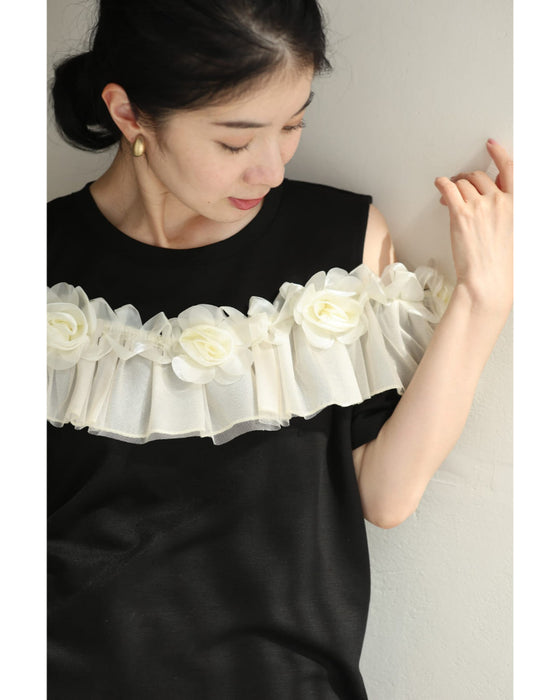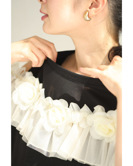 ■フラワーモチーフにフリルチュールで顔周りが華やかな印象に。