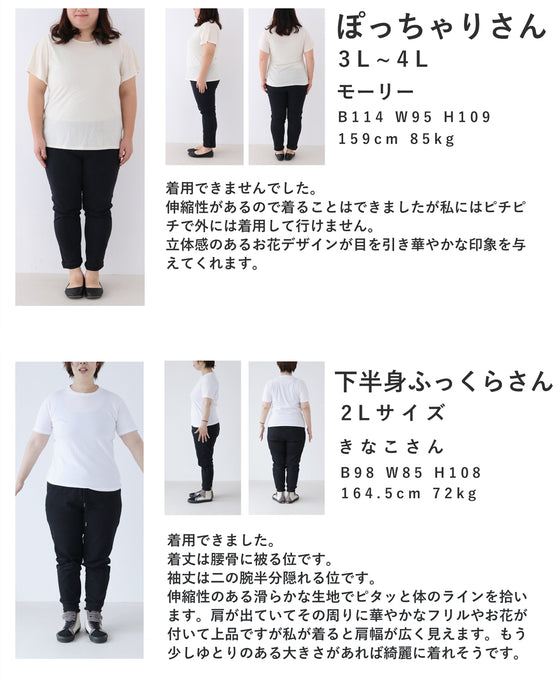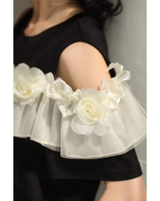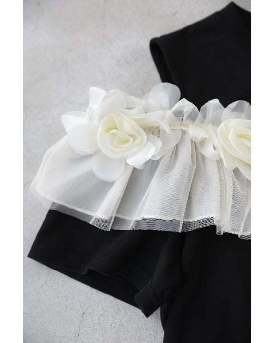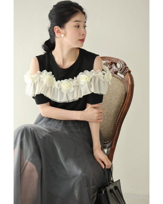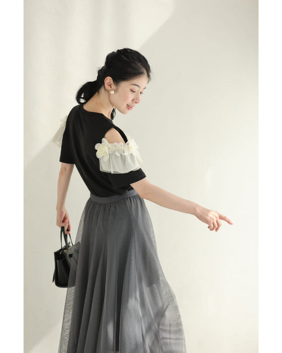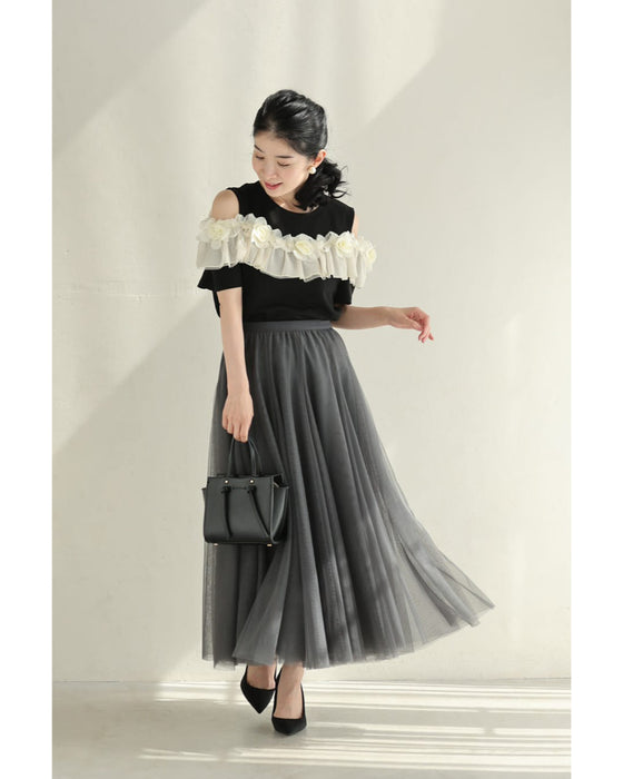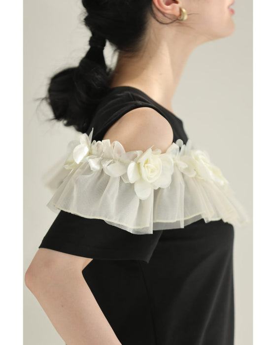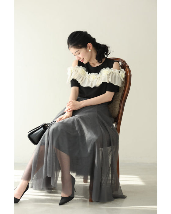 ふんわりと重なり合うチュールに咲く花々が上品で可憐な印象を与え、シンプルなボディ部分とのコントラストでより立体感が際立ちます。