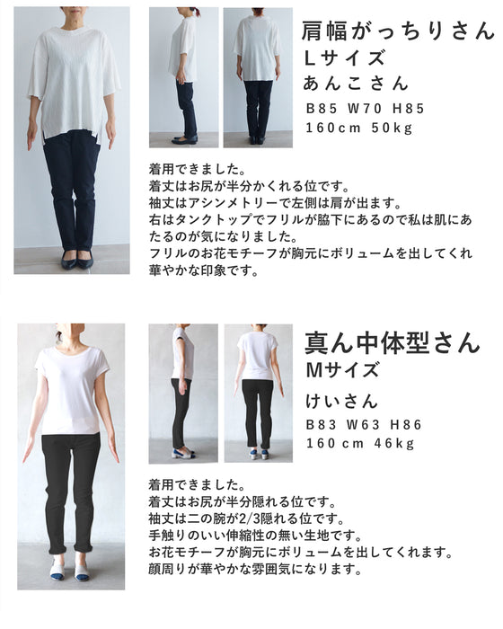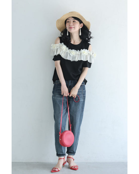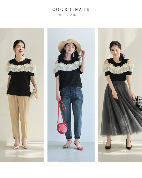 オフショルダーのデザインは、気になる二の腕を程よくカバーしながら抜け感を演出できるのが嬉しいポイント。女性らしさを引き立てつつ、軽やかで夏らしい雰囲気を漂わせます。