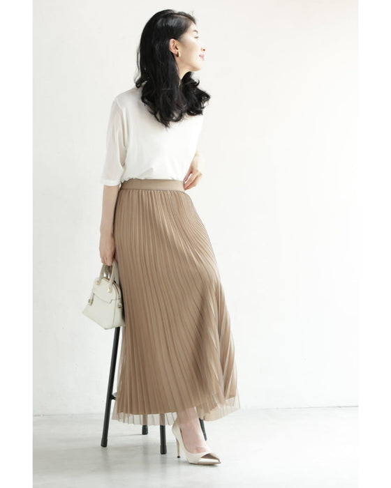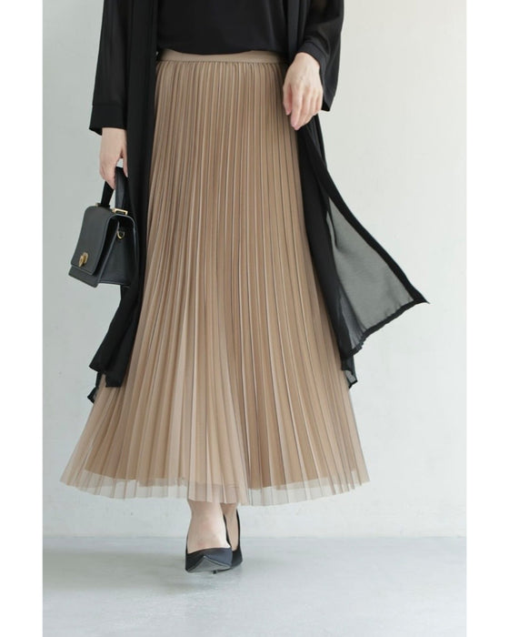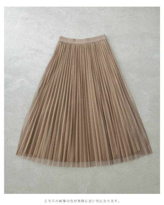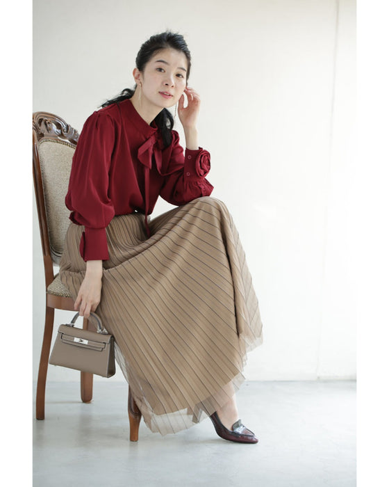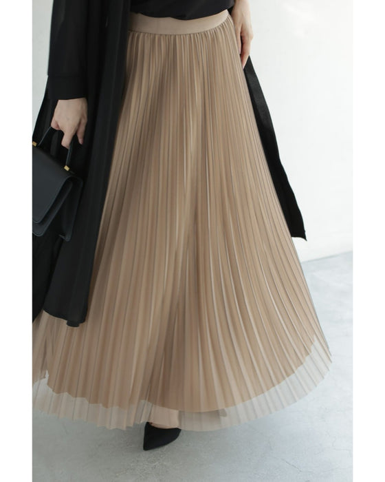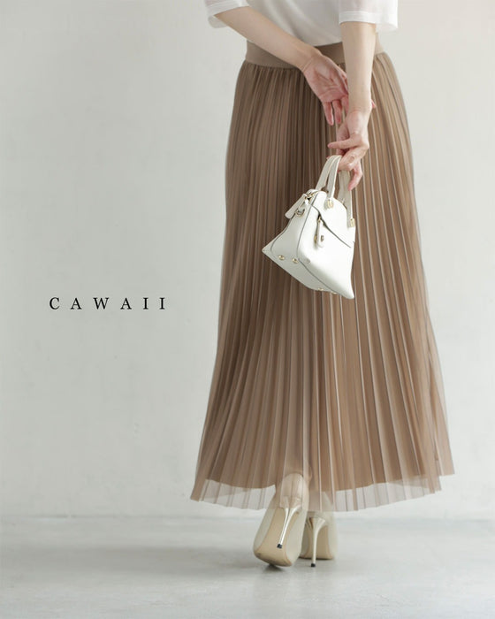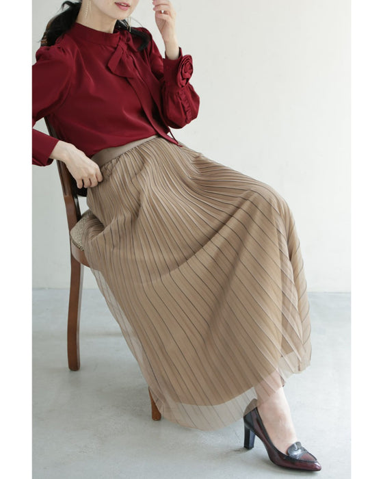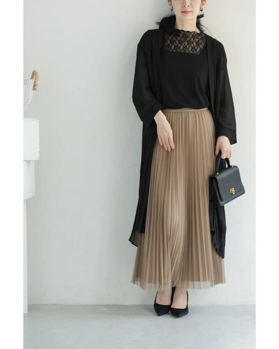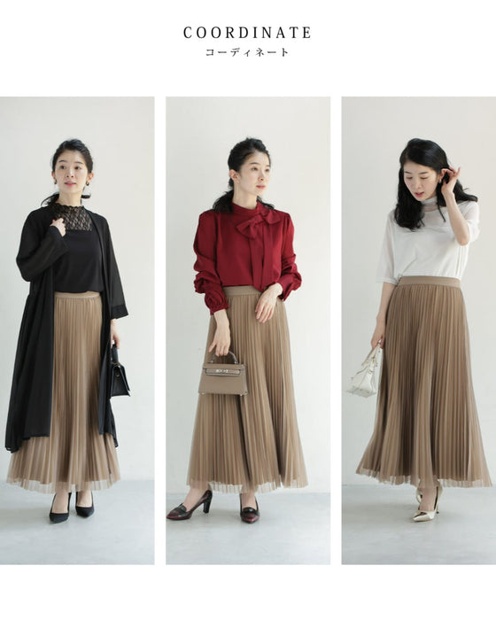 異なる質感を重ねることで、奥行きと立体感が際立つ仕上がりに。シンプルなトップスを合わせてもコーディネートが完成するほど、スカート自体に存在感があります。動きや光の当たり方によって表情を変えるため、シーンによって違った印象を楽しめるのも魅力です。