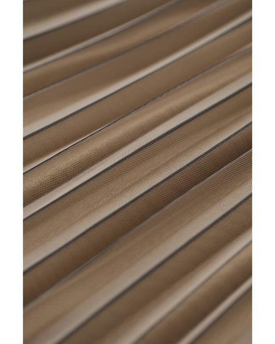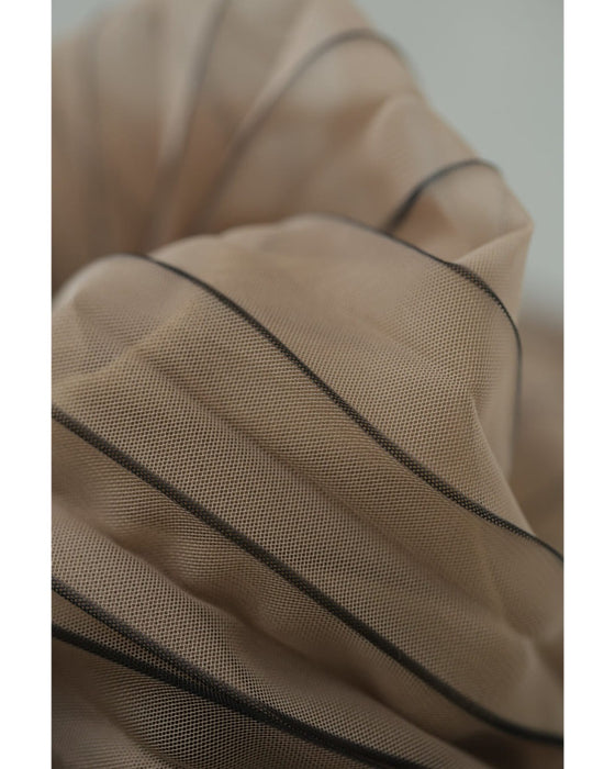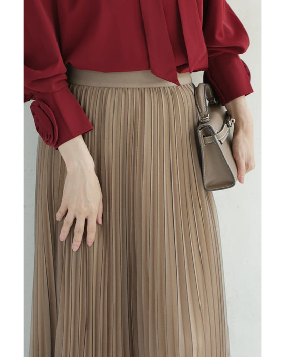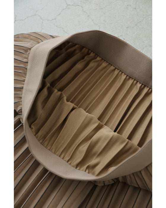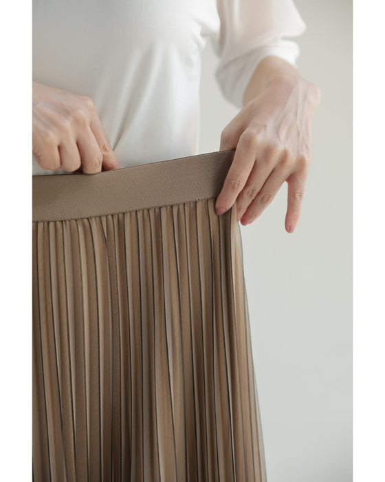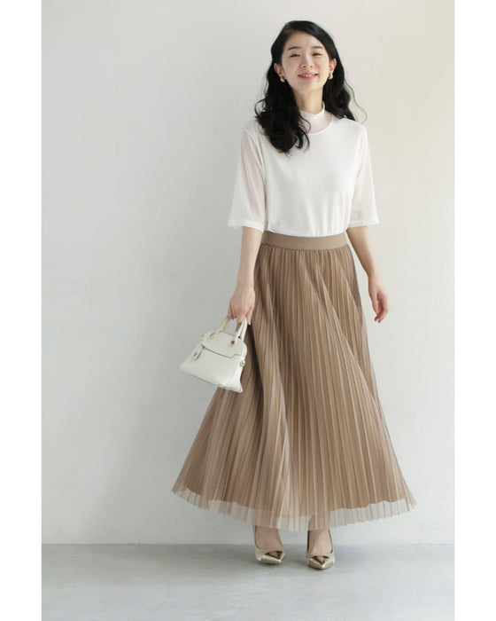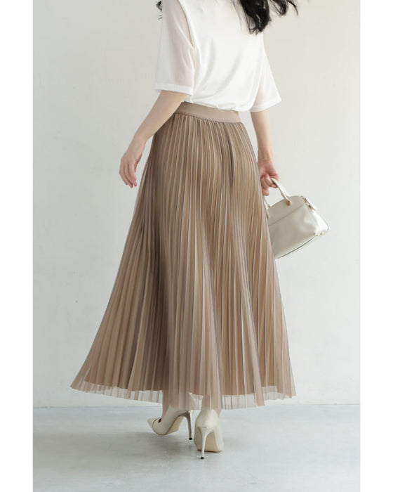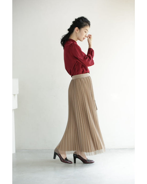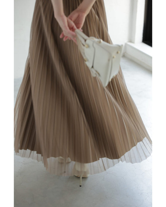 異なる質感を重ねることで、奥行きと立体感が際立つ仕上がりに。シンプルなトップスを合わせてもコーディネートが完成するほど、スカート自体に存在感があります。動きや光の当たり方によって表情を変えるため、シーンによって違った印象を楽しめるのも魅力です。