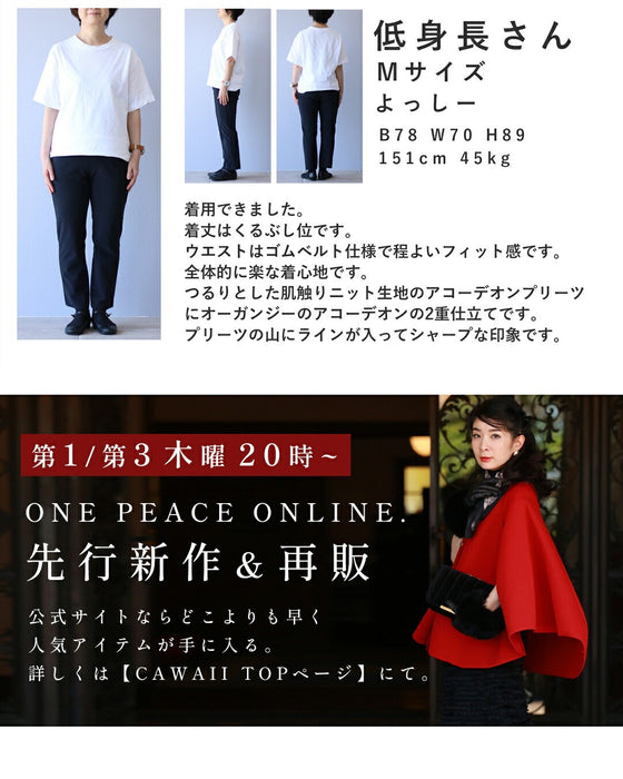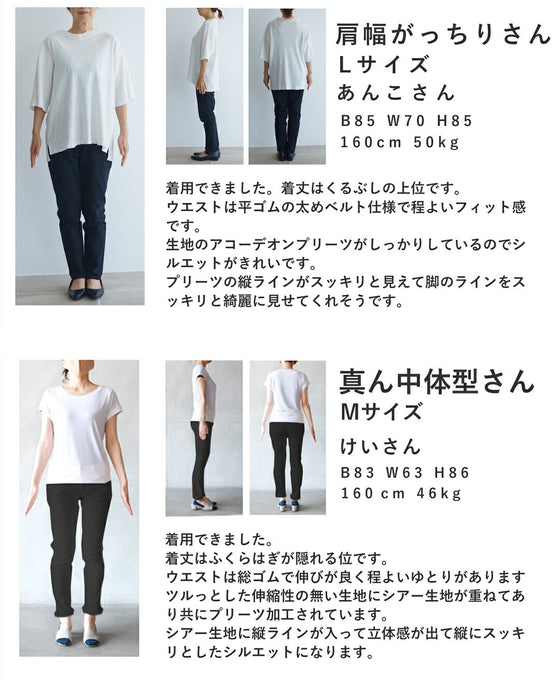 ウエストはゴム仕様で快適な穿き心地。締め付け感が少なく、長時間の着用でもストレスを感じにくいのが嬉しいポイントです。リラックス感がありながらも、しっかりときれい見えを叶えてくれるため、デイリーからお出かけまで幅広く着回せます。