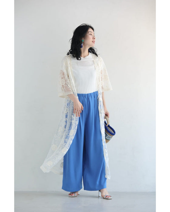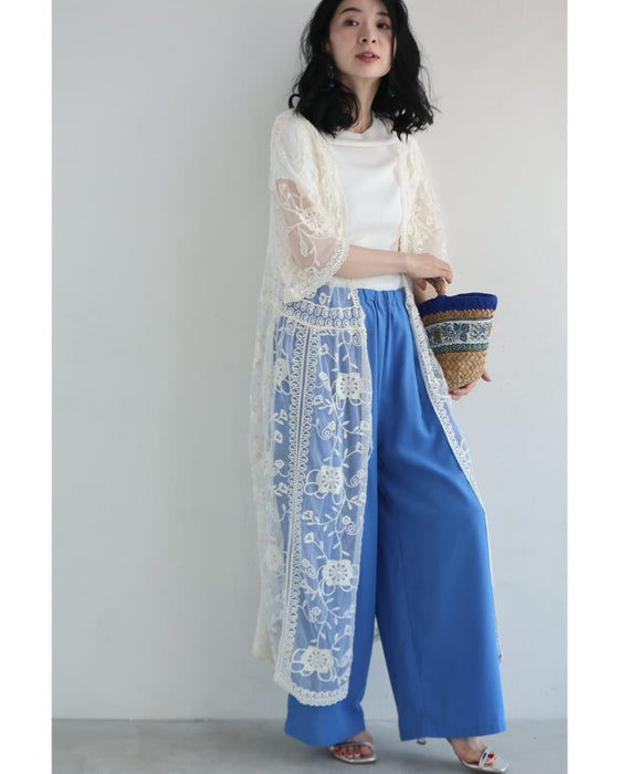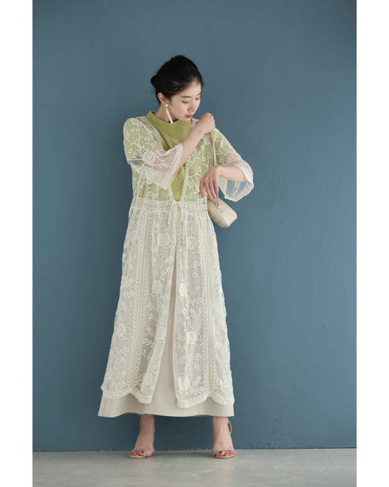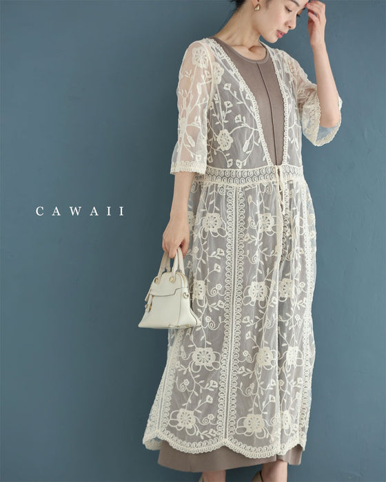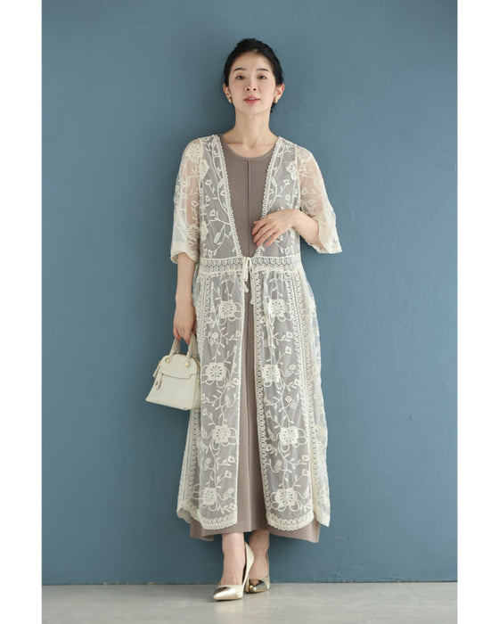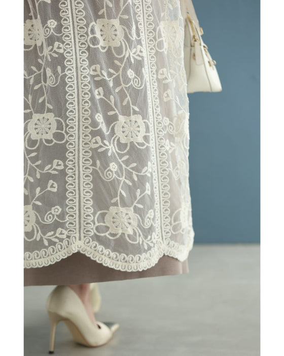 繊細な蔦花モチーフの刺繍が施されたチュール素材のベールカーディガンは、透け感がありながらも上品な雰囲気を纏わせ、いつもの装いに特別感をプラスしてくれます。