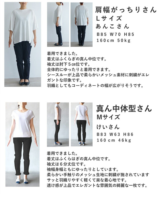 五分袖デザインで、気になる二の腕をふんわりとカバー。肌を隠しながらも重たくならない絶妙なバランスで、涼しげな印象をキープできます。