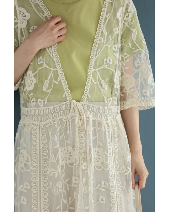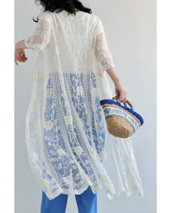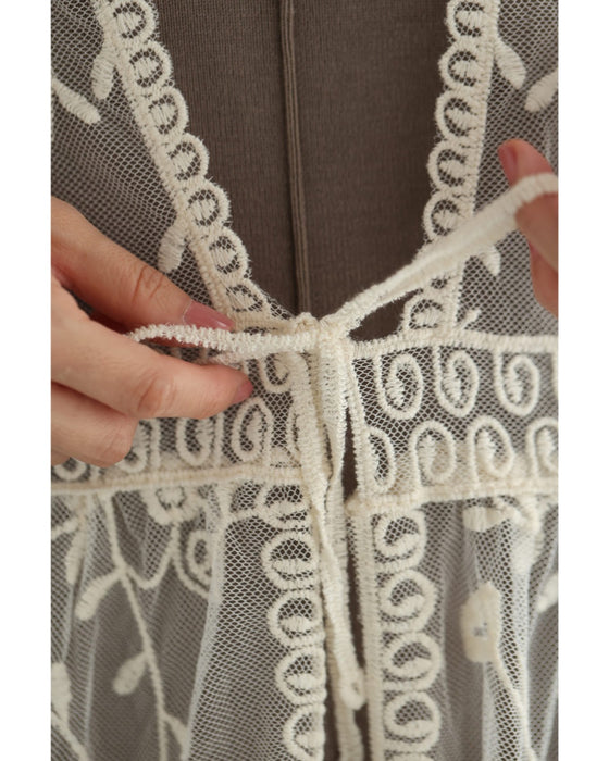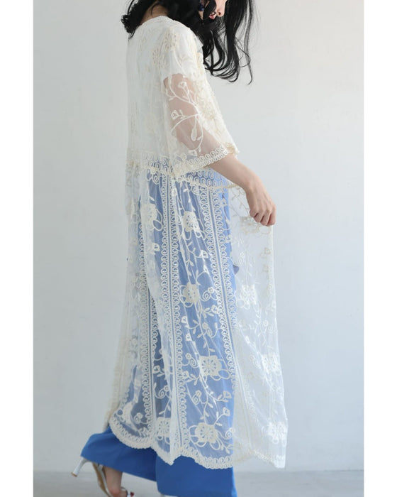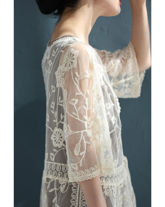 二の腕までカバーする蔦花刺繍ベールカーディガン