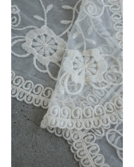 ほんのりと肌を透かす繊細なチュール素材は、軽やかさと女性らしさを両立。透け感が美しく、刺繍の模様を引き立てながら、奥行きのある上品なレイヤードスタイルも叶えてくれます。