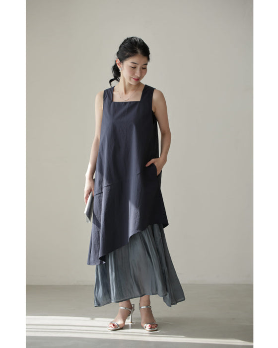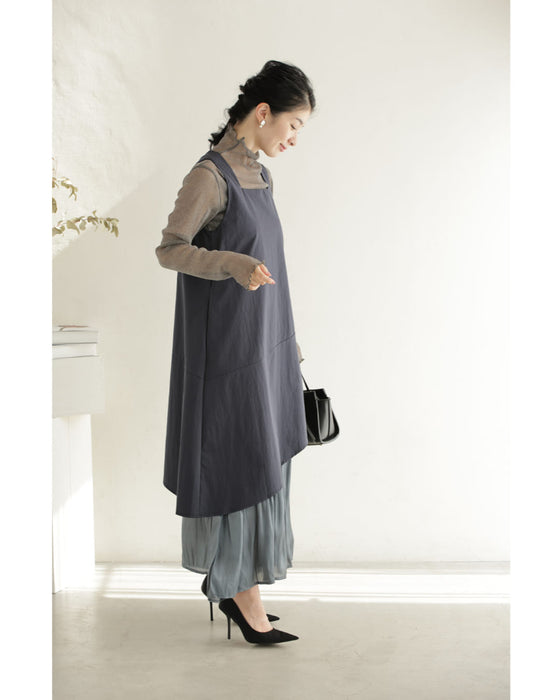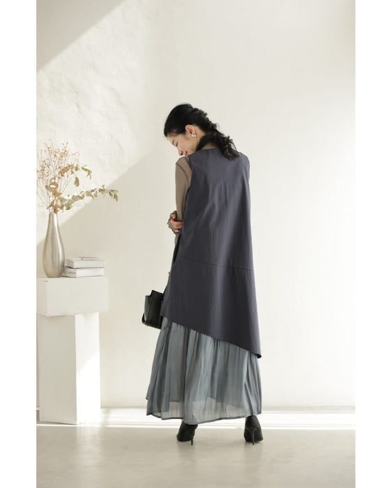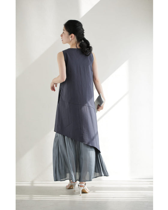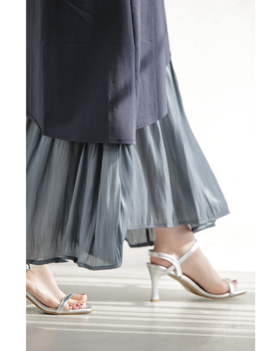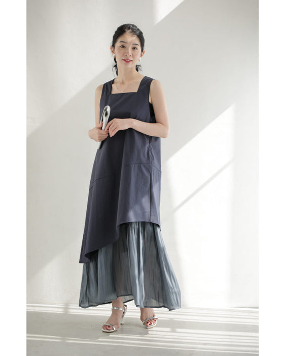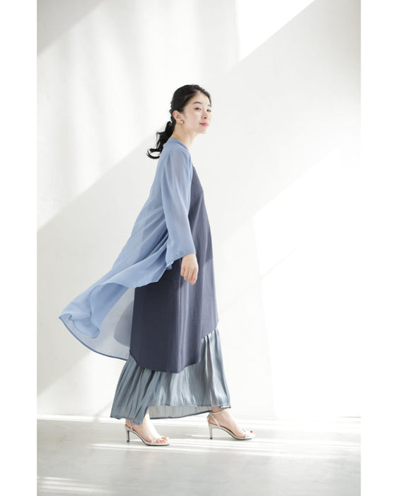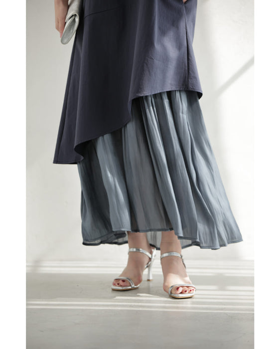 アシンメトリーな切り替えデザインが視線を引き、シンプルなのに一枚でこなれ感。動きのある軽やかなシフォン素材が重なり、歩くたびに美しく揺れるレイヤードスタイル