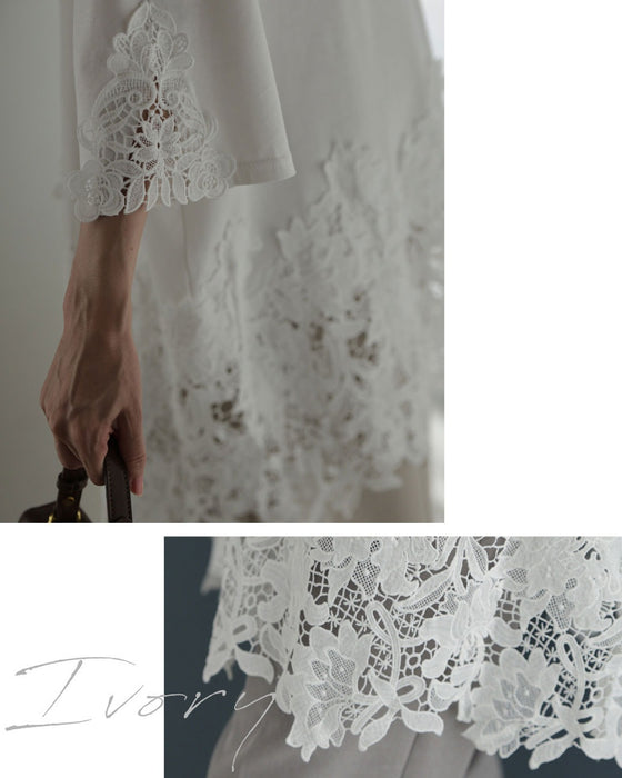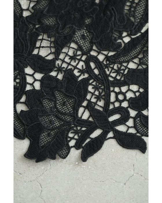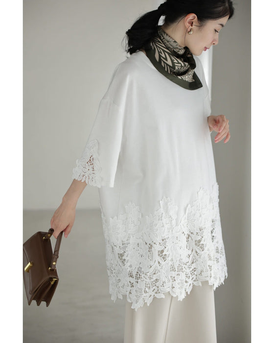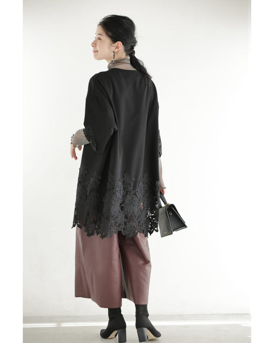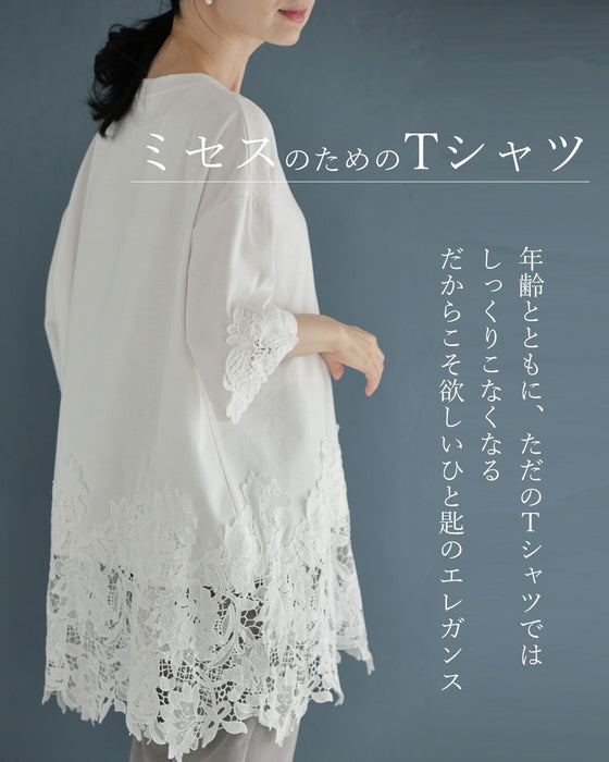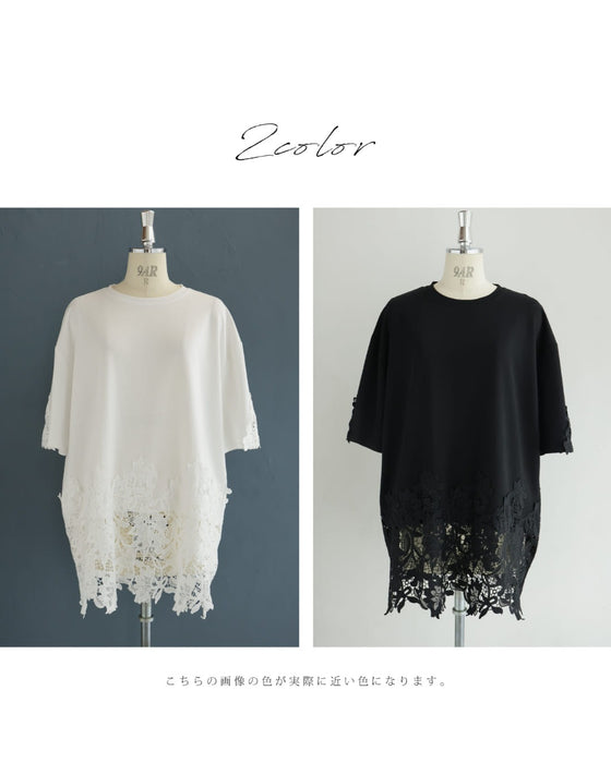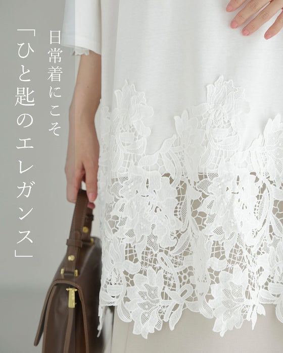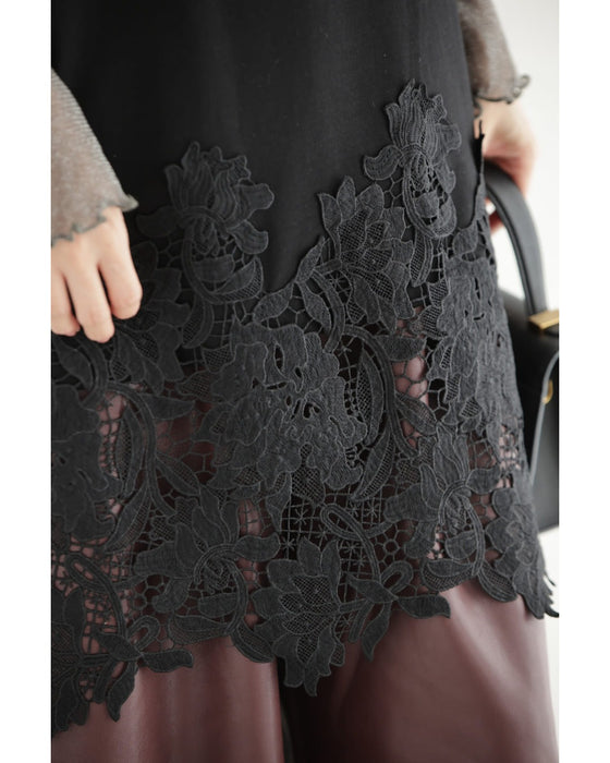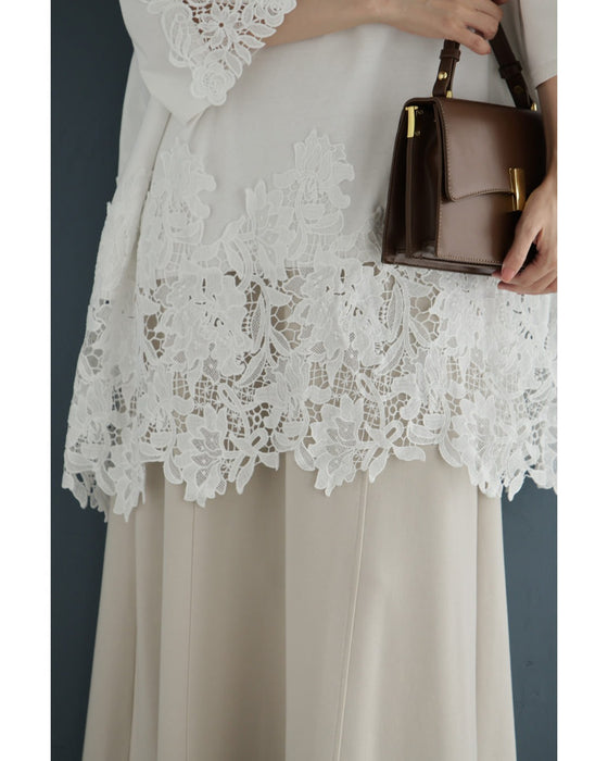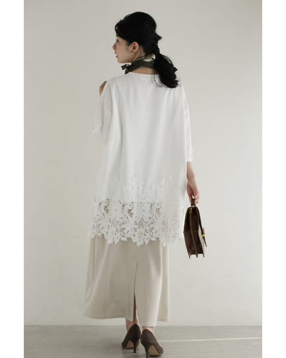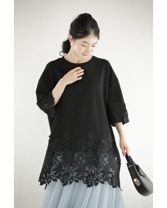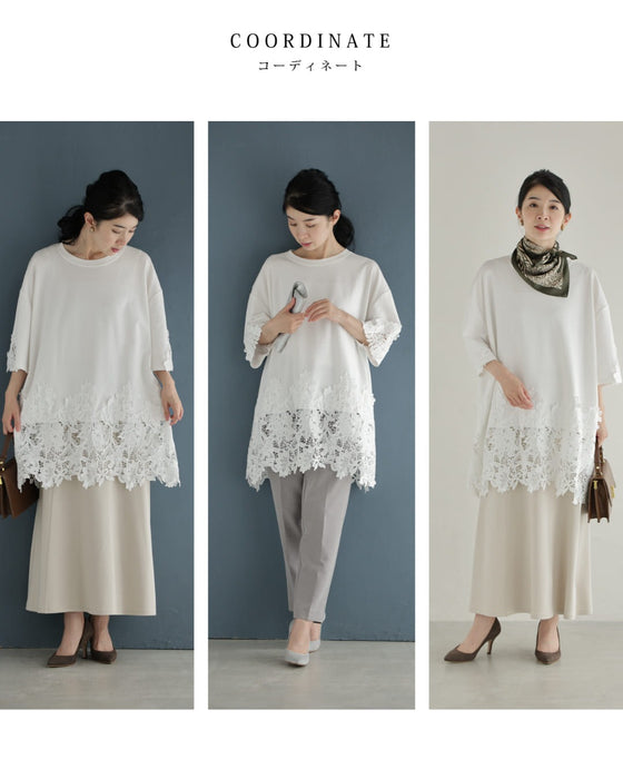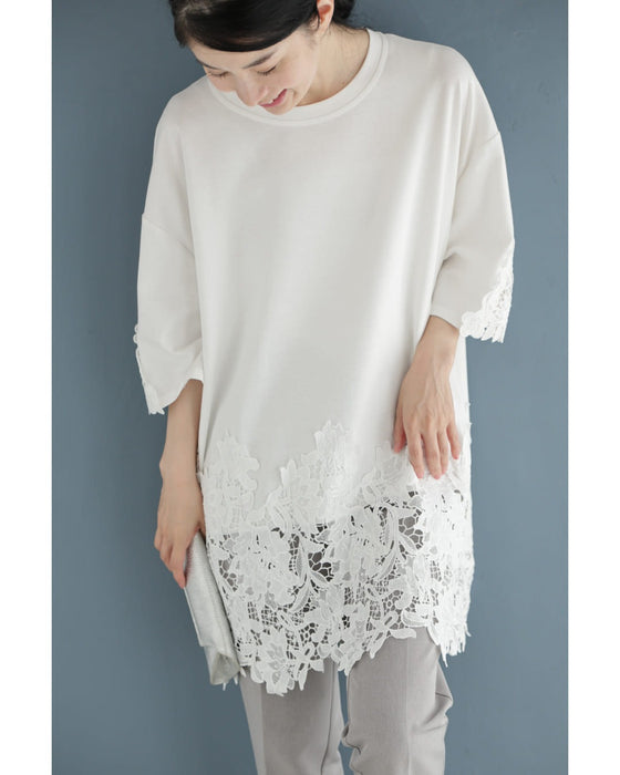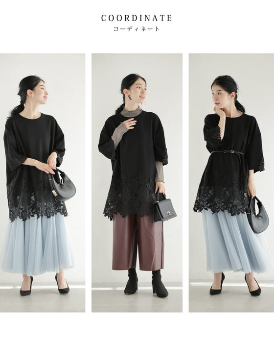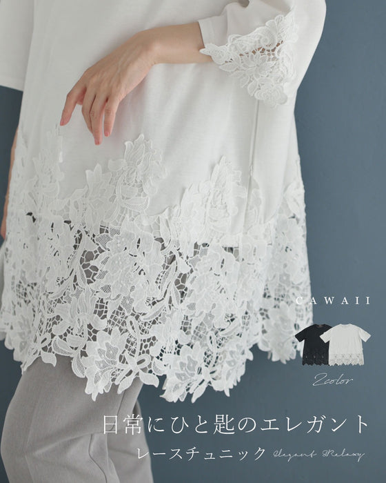 腰回りをぐるりと囲むように施されたたっぷりとしたレースが印象的な、大人の女性にぴったりのチュニックトップスです。贅沢にあしらわれた細やかなレースの透け感が女性らしさを引き立て、パンツにもスカートにも合わせやすいデザイン。