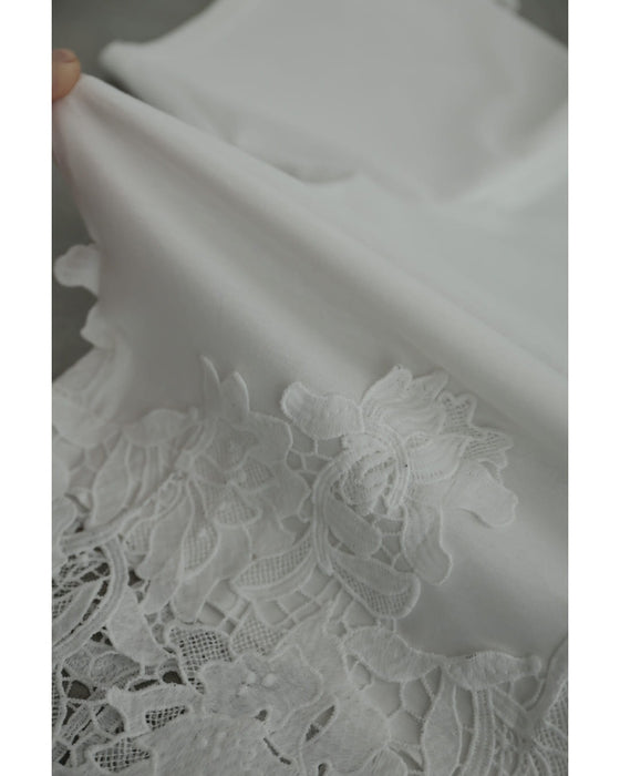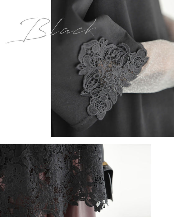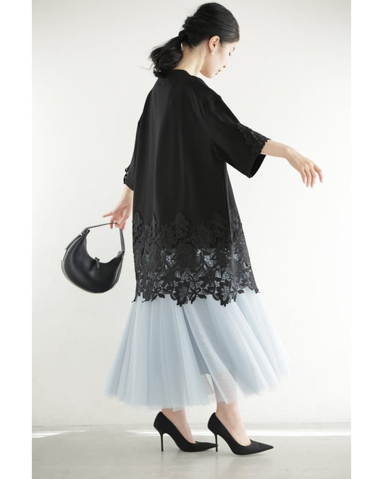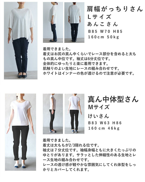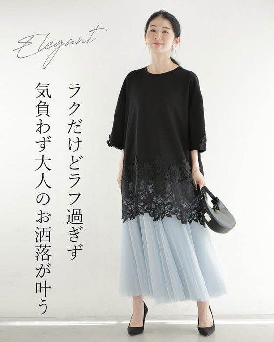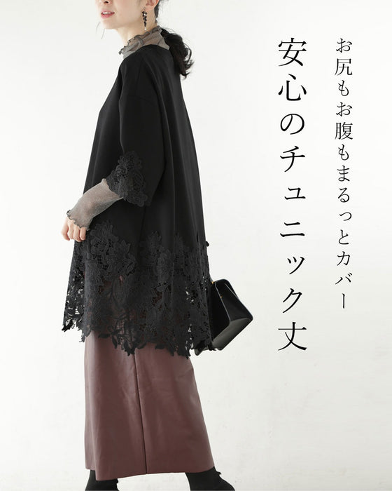 ふんわりと広がるレースが自然に体型をカバーしつつ、気になる腰回りやお尻までしっかり隠せる丈感が嬉しいポイント。シンプルなボトムに合わせるだけで華やかな印象をプラス。