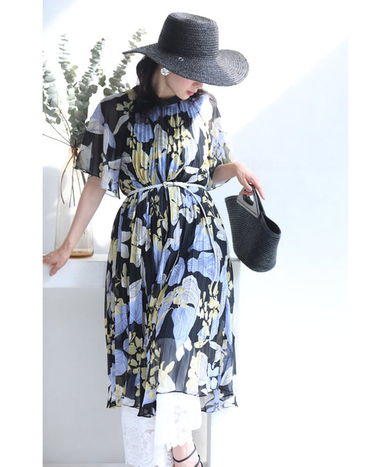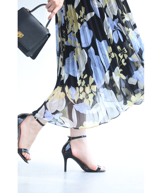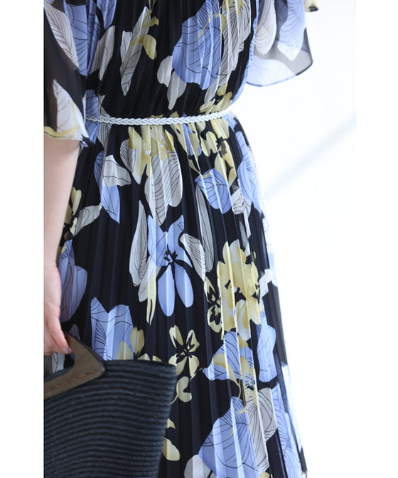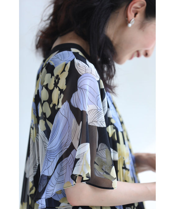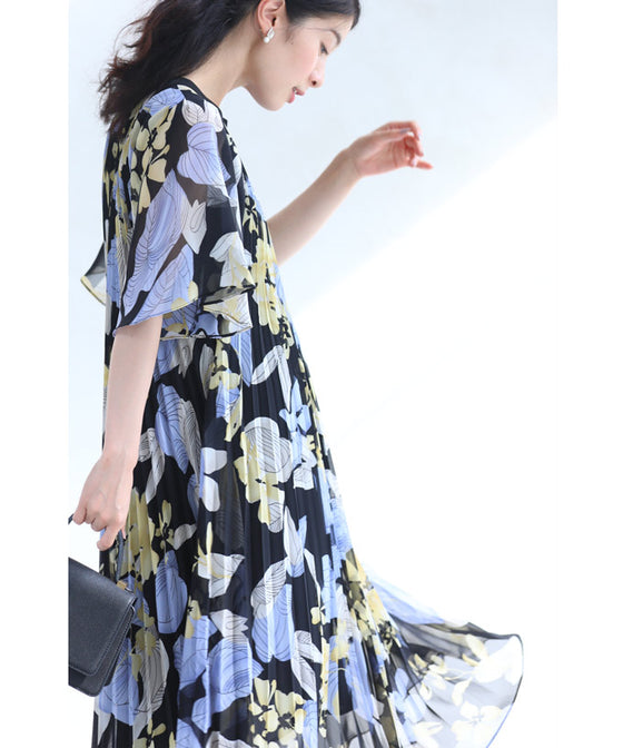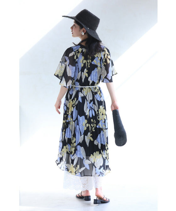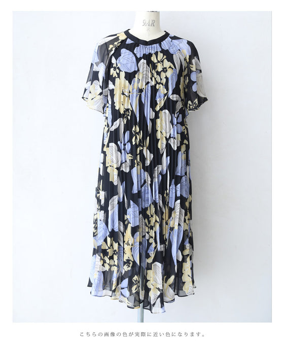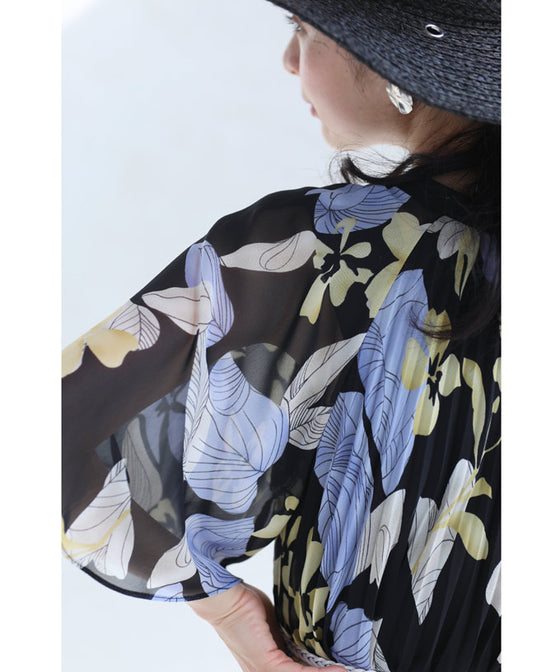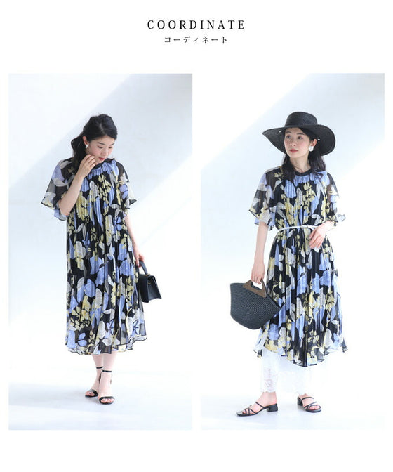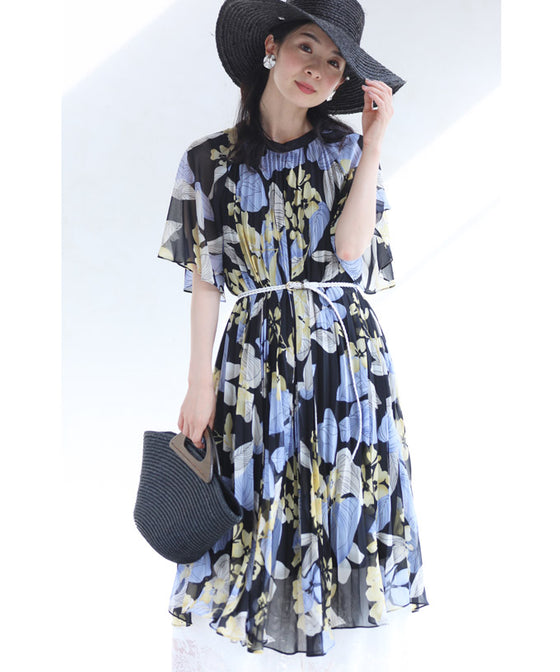 A sheer floral mid-length dress with pleats that flares out from the neck