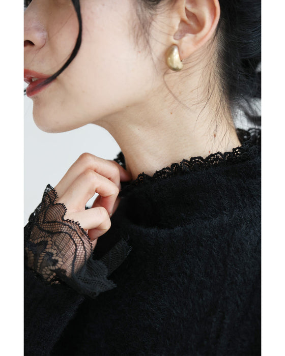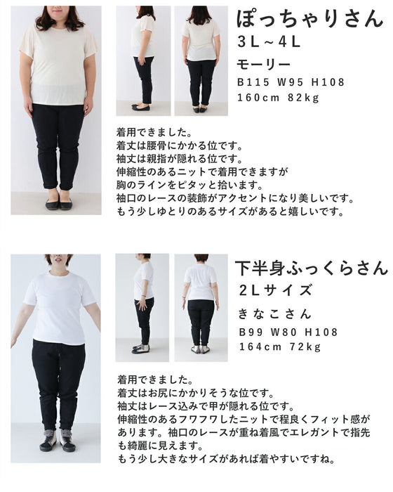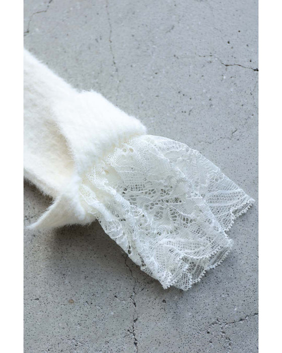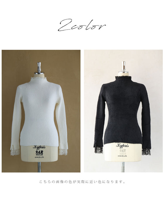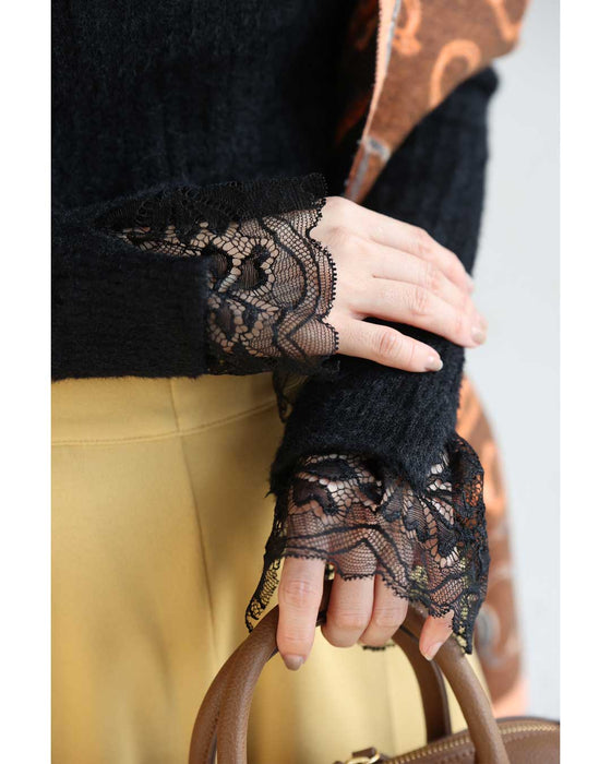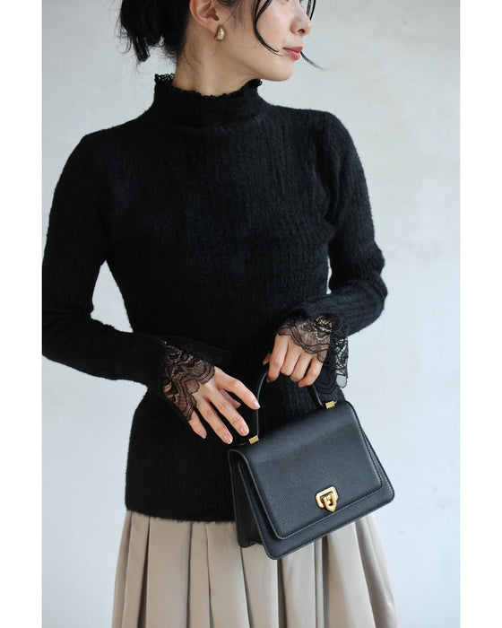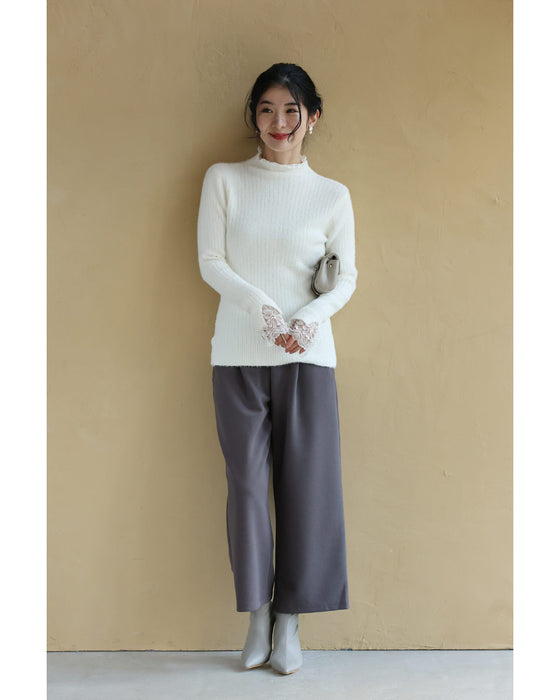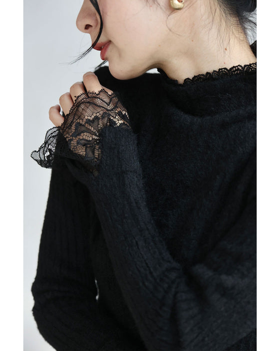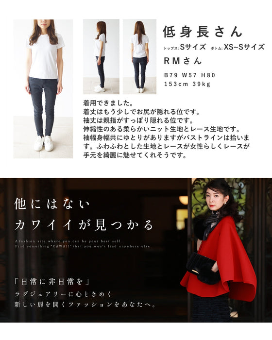 This brushed knit cut-and-sew top features lace sleeves that add a touch of glamour to your hands and an innovative layered look that creates a three-dimensional effect.