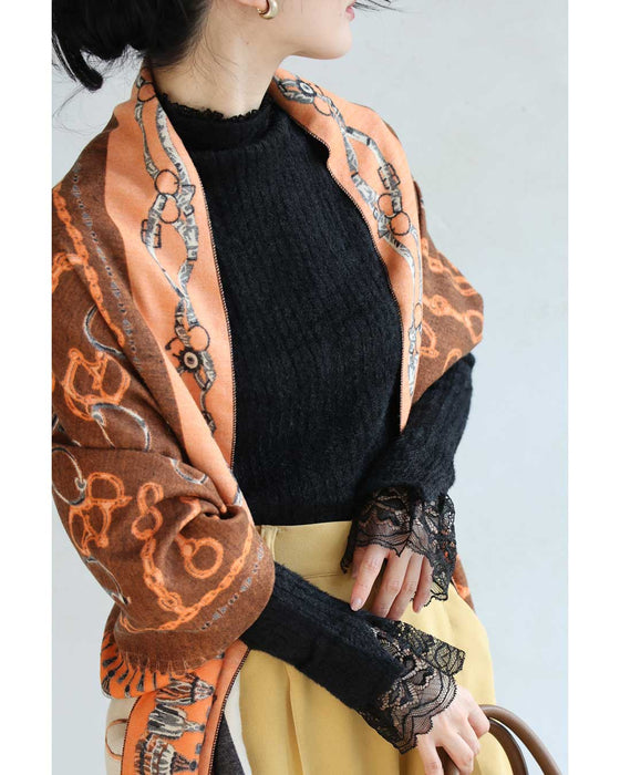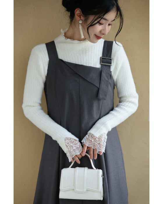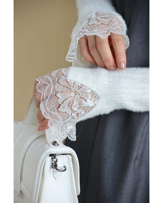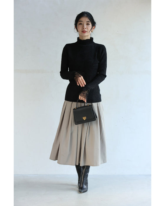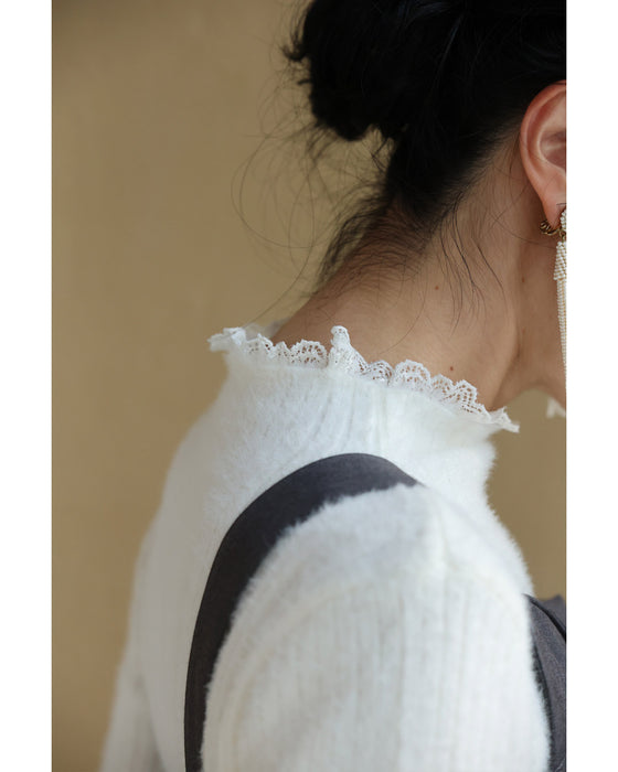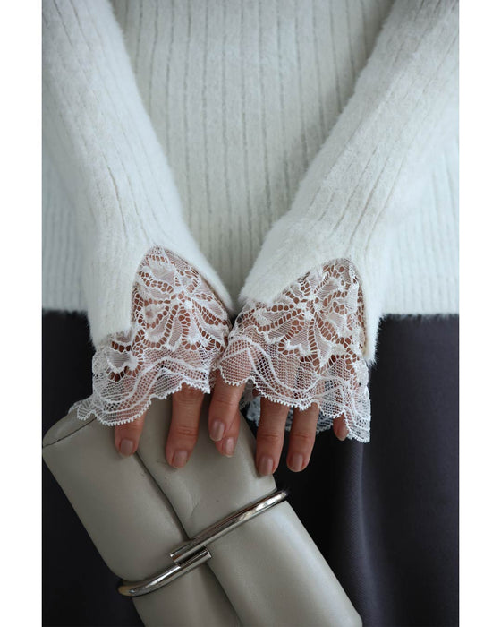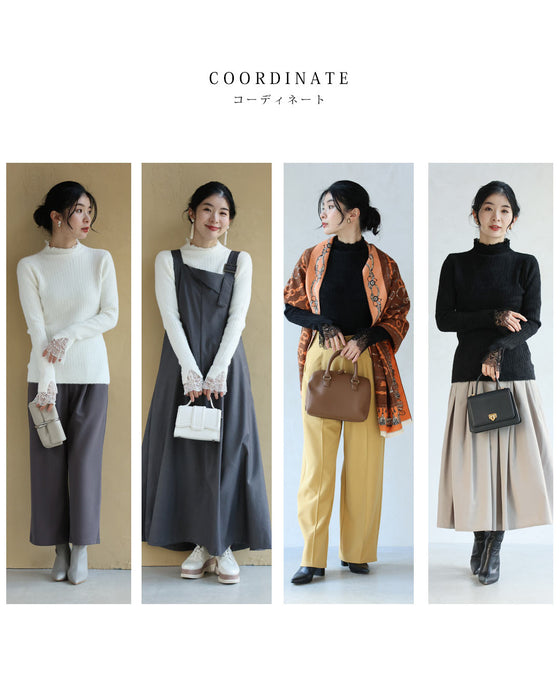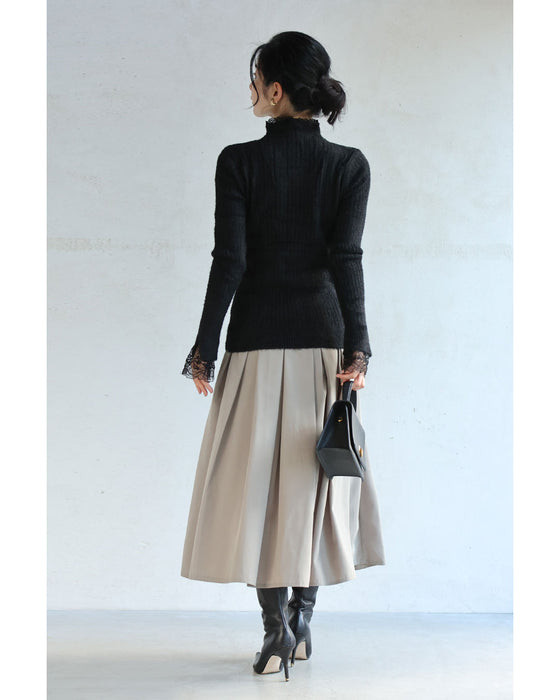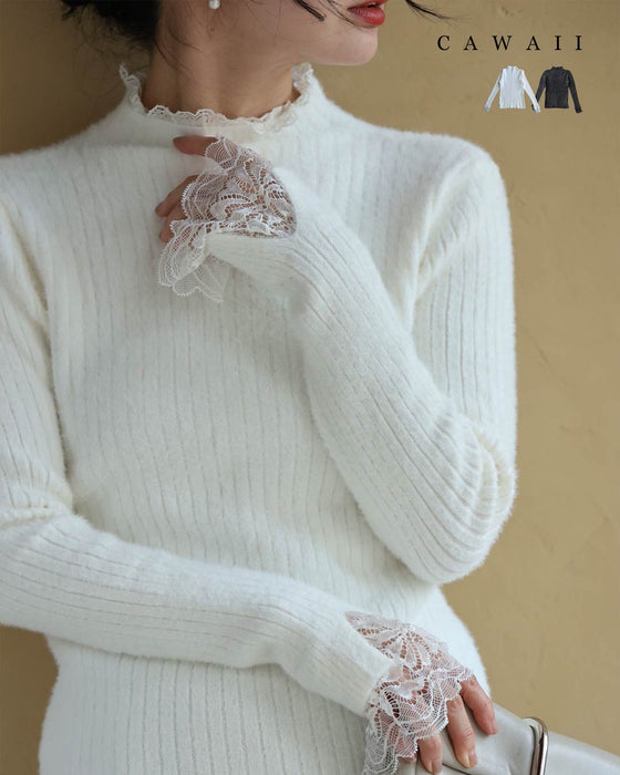 This brushed knit cut-and-sew top features lace sleeves that add a touch of glamour to your hands and an innovative layered look that creates a three-dimensional effect.