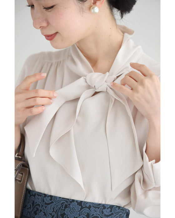 洗練されたデザインと柔らかな着心地が魅力の、アシンメトリーリボンネックのブラウストップス。左右非対称のリボンデザインが程よいアクセントとなり、シンプルながらも個性的な印象を演出します。