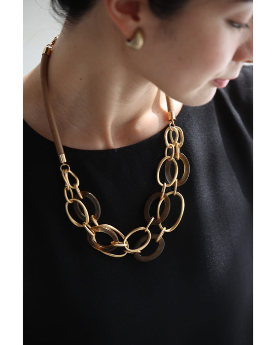 ボリューム感のある二連チェーンは、異なる素材を組み合わせたことで、表情豊かで個性的な印象に。存在感がありながらも品のあるデザインは、大人の女性にもおすすめです。