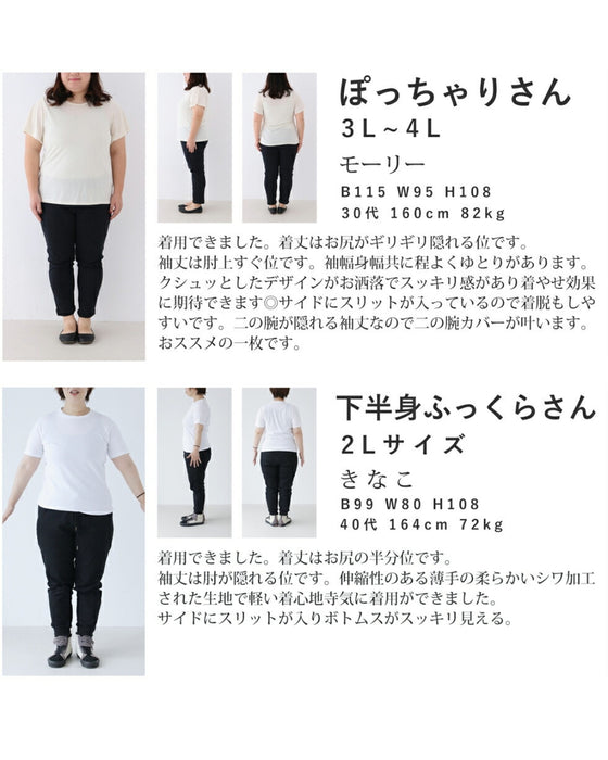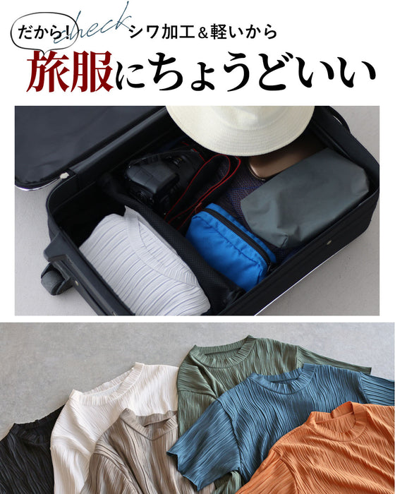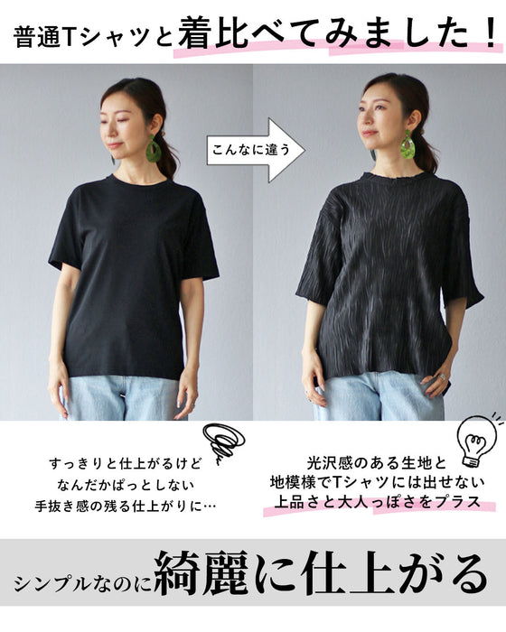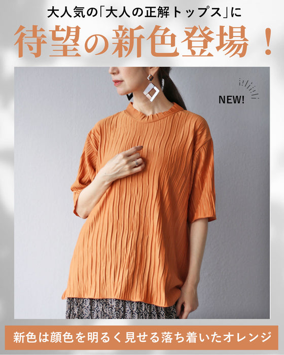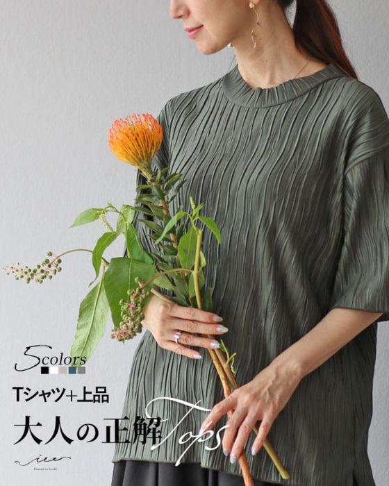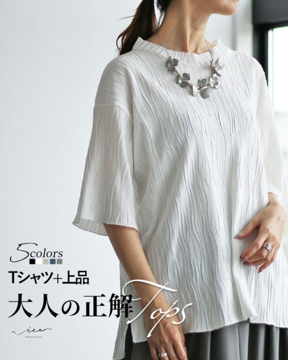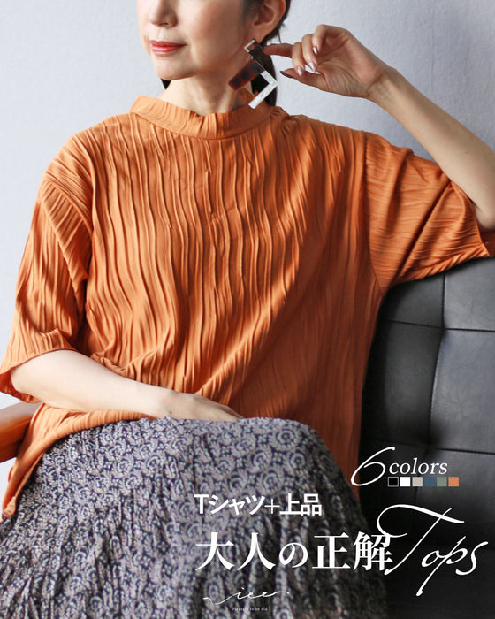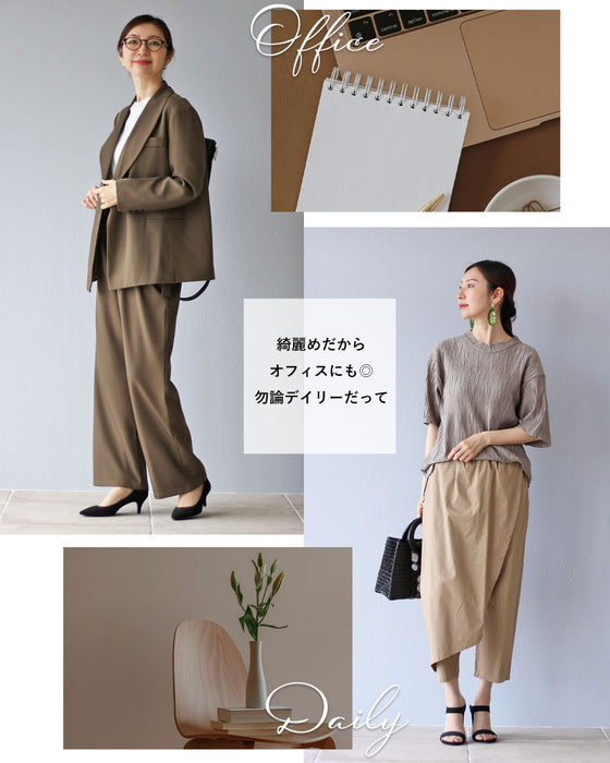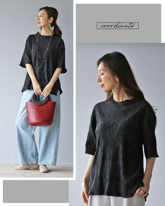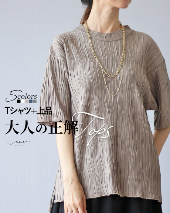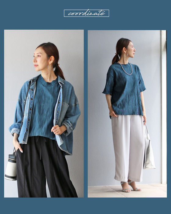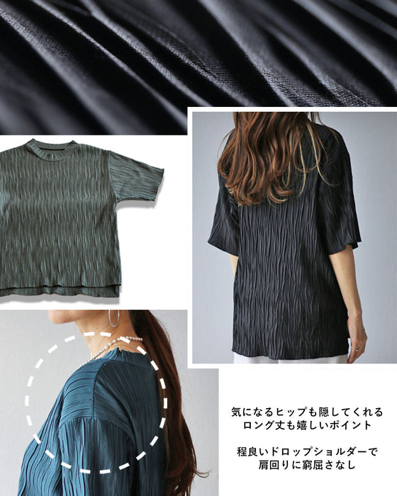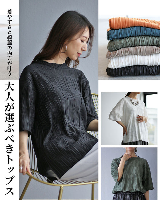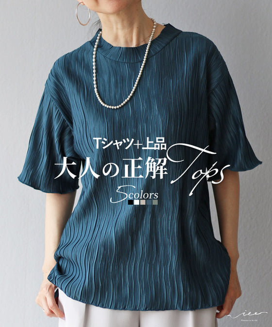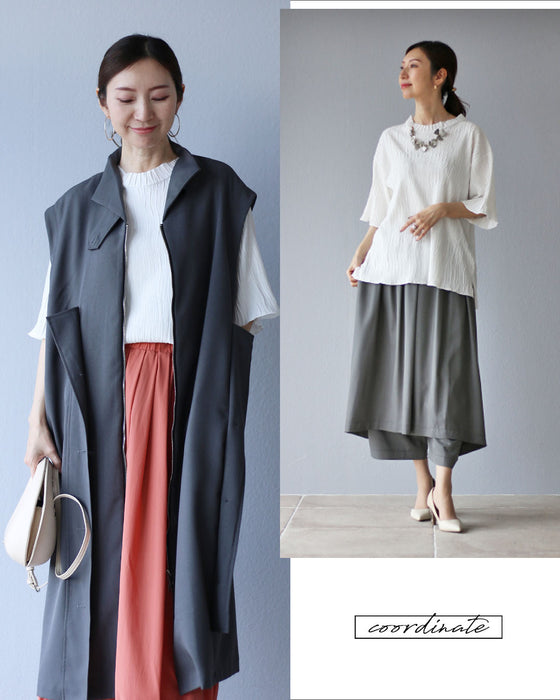 The lustrous and elegant material and simple yet eye-catching pleats create a graceful drape with every movement, giving a sophisticated impression. It also goes well with any bottoms and can be styled in a variety of ways, making it suitable for a wide range of occasions, from everyday wear to special occasions.