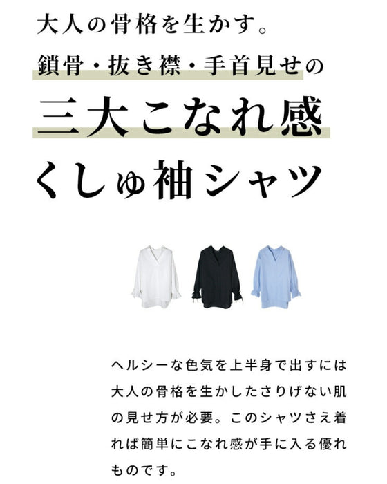 A shirt with three types of crinkled sleeves that show off the collarbone, off-the-shoulder collar, and exposed wrists