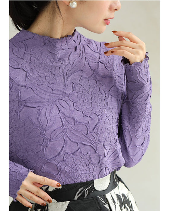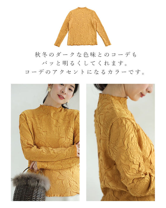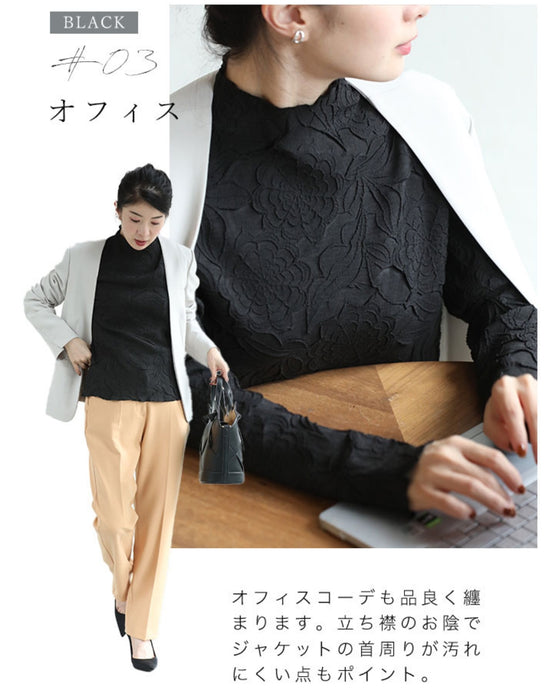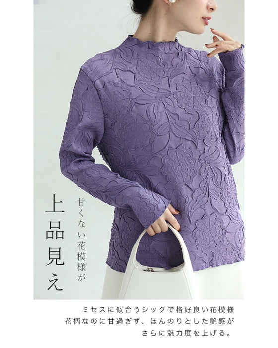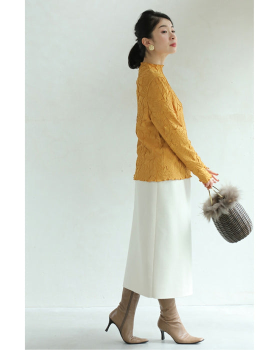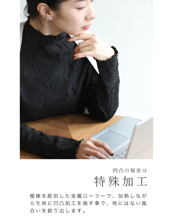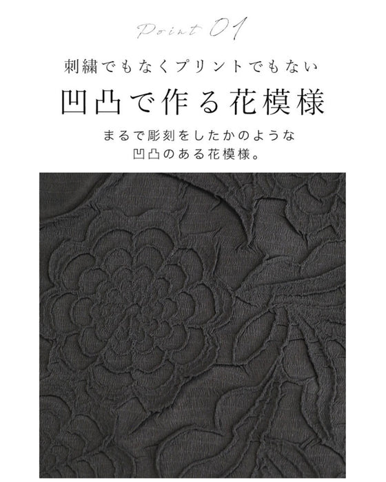 The floral pattern is neither embroidery nor print, but made with a raised and recessed surface, as if it were carved. The pattern is subtle, but stands out clearly with the use of shadows. This raised and recessed surface gives the garment a unique look.