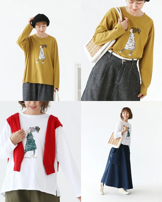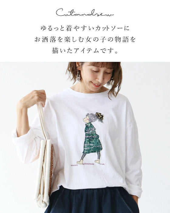 This item, a loose-fitting cut-and-sew top, depicts the various days off of girls who enjoy fashion.