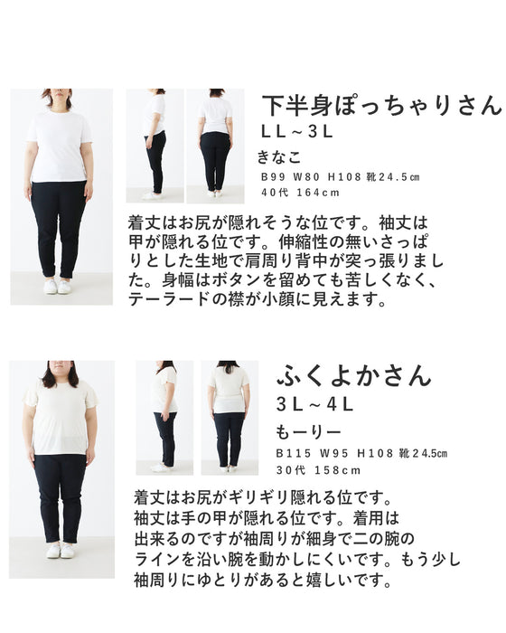 | Size | 肩幅 | 身幅 | 着丈 | 前下がり | 袖丈 | アームホール | 袖口 |